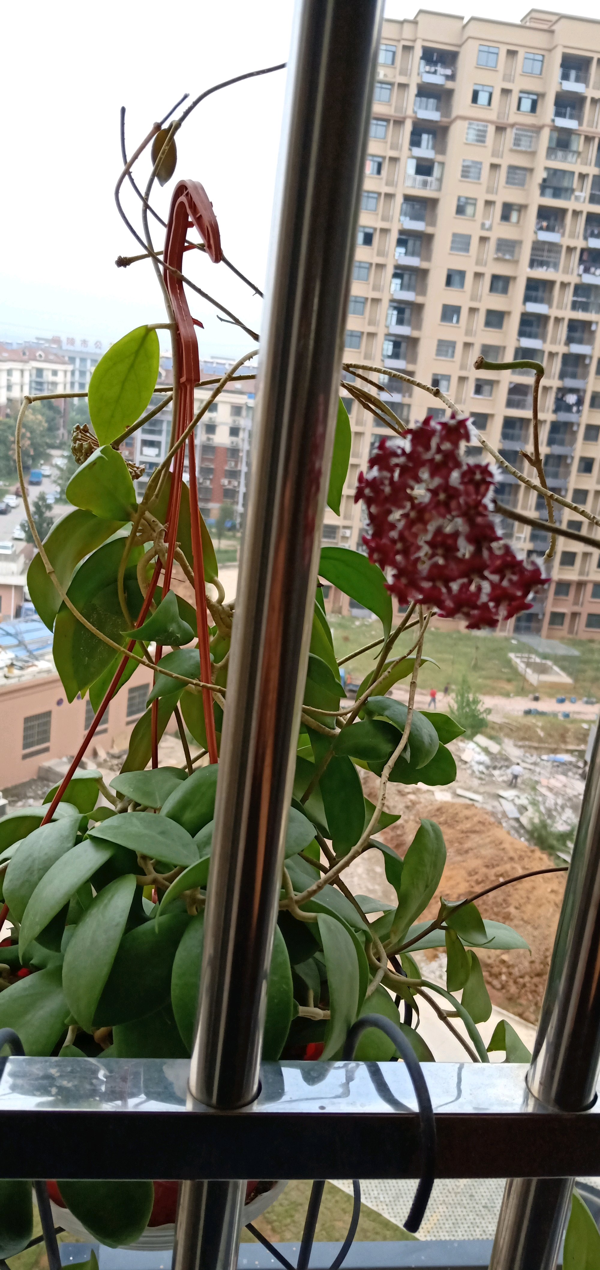 棉德岛红火球球兰,度娘说原产于菲律宾。像北窗台这样难得见到直射光的地方,养不了月季,养球兰倒是个不错的选择。