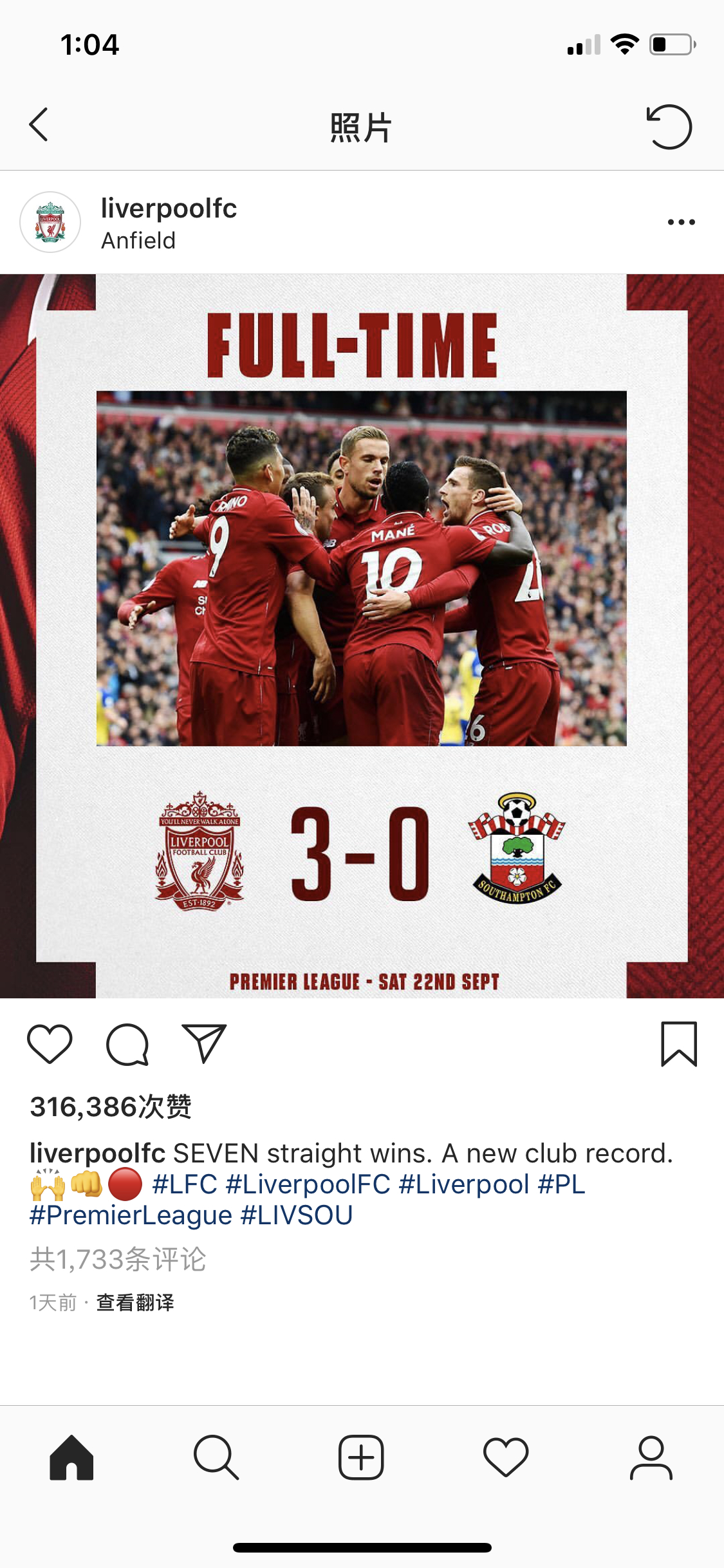 9.22回到英超赛场,利物浦主场迎战南安普顿,上半场就3:0