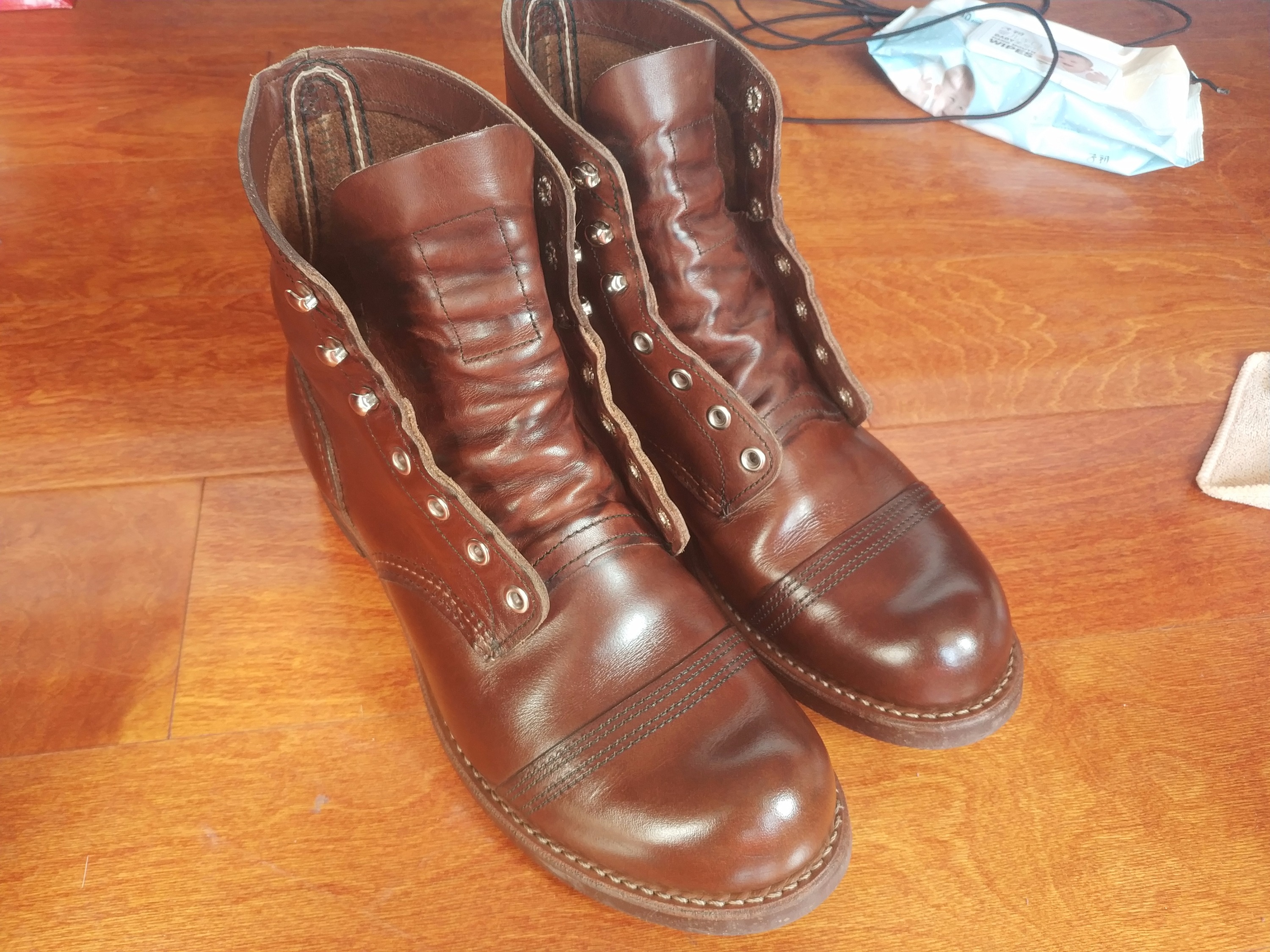 夏天前封箱保养,油用的不多,亮是因为每次穿完都用刷子刷灰尘,磨砂面的油皮抛光了。
