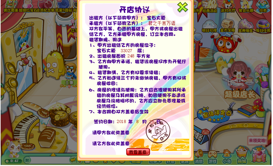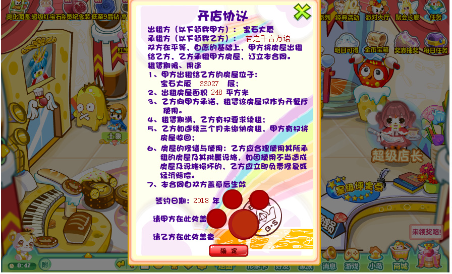 2015~2017年退了一段時間,2018年看到紅寶石周年慶和寶石大廈重新營業的消息決定回來開店——終於等到了寶石大廈重新營業,不知道這次關閉之後下次要什麼時候開啟。(當時還給奧比島的客服小編寫過郵件就一些場景的開發提出自己hen zhong er 的想法)