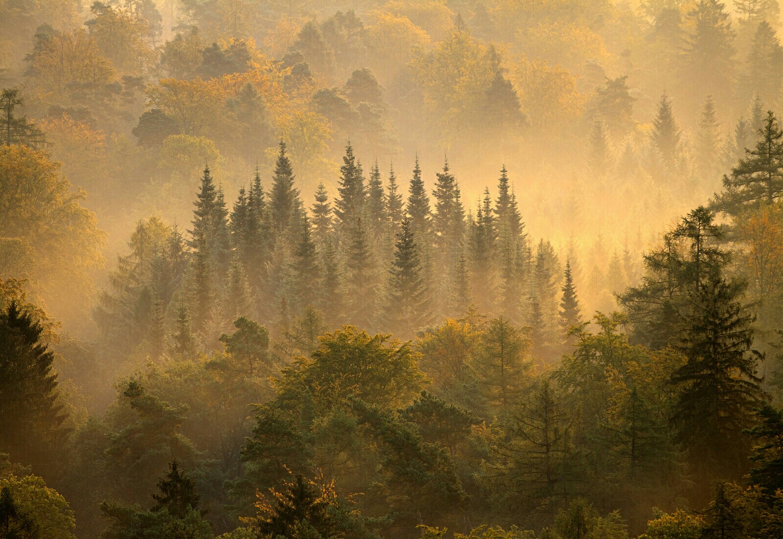 泛着金色光芒的麦田与绿色的草木相互交织在一起。