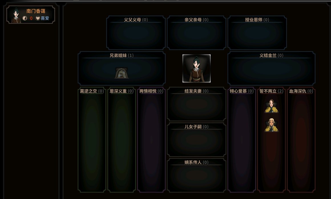 我觉得应该给太吾村民之间设置一个潜在关系,大约是莫逆之交的水平但是不会显示在关系图上,这才符合太吾村民风淳朴的特性啊