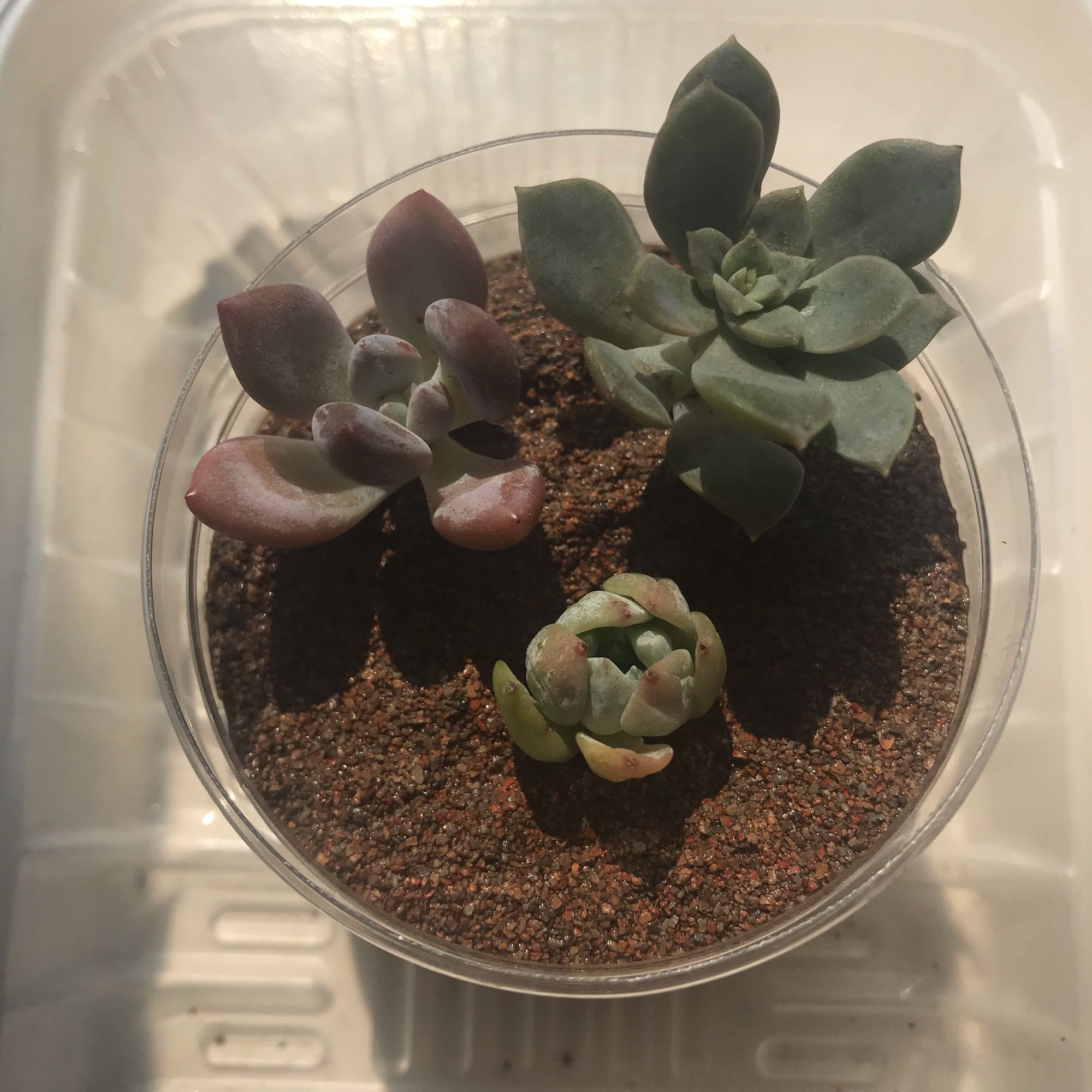 新手萌新,在吧里如饥似渴的学习了一遍养肉的流程,才发现以前有个很错误的认识。总怕自己养不活,刚刚到家的肉肉都给个饭盒或者一次性杯子之类的。今天第一次学着给饭盒中根系长得好的几个小东西上盆,铺面,定装。虽然都是小苗,但是好期待它们的蜕变