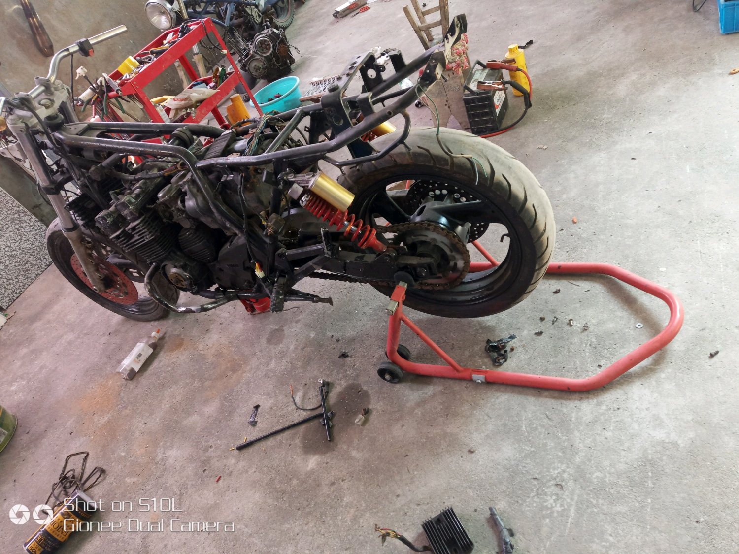 俩款车减震内部比较大 xjr400原装减震没有这个cbf1000的高端 xjr400的减震回弹的时候没有阻尼 这个cbf1000有 看图吧 减震油锃亮 干净