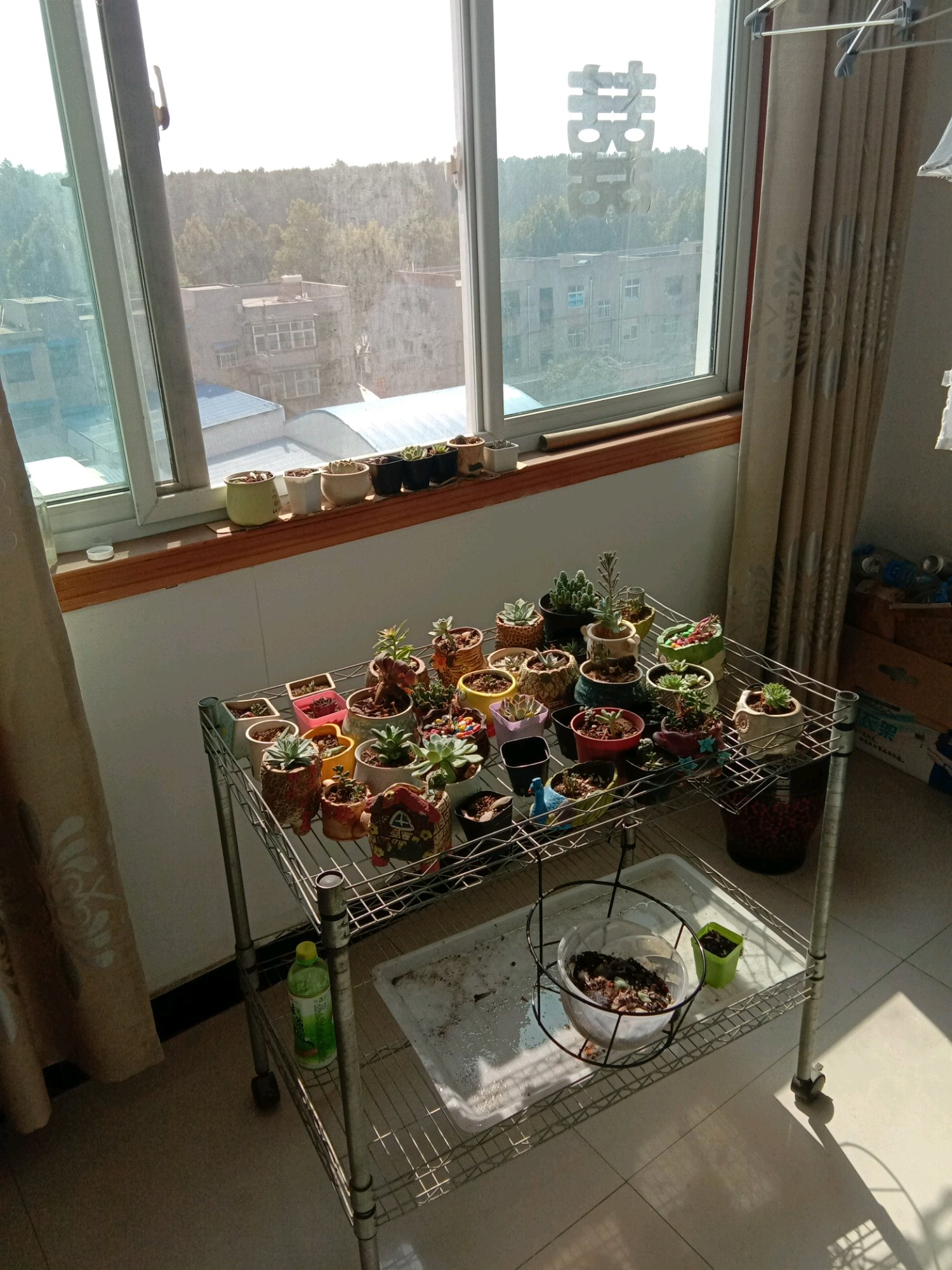 其实你可以买或者订做一个木条的花架,大小正好够放在飘窗内,高度刚好与上层窗户开口的地方平齐,由此解决了高度和通风问题。这样可以在飘窗上摆两层。看着也比铁架子美观。