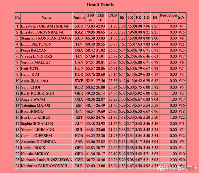 挑战赛芬兰杯女单短节目比赛结束,俄罗斯选手Elizaveta Tuktamysheva成功完成3A、73.83分居首;哈萨克斯坦的Elizabet Tursynbaeva干净地完成节目,70.95分位列第二;另一名俄罗斯选手Stanislava Konstantinova连跳第二跳周数不足、65.39分排名第三。