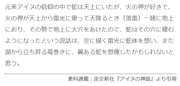 顺着这条线继续查下去,更可以查到,本来爱努信仰中,有种说法是蛇原本是生活在天上的生物,因为喜欢火神,火神随着落雷下凡时在地上辟出了大洞,于是蛇也跟着来到了地上。(外星人实锤?)
