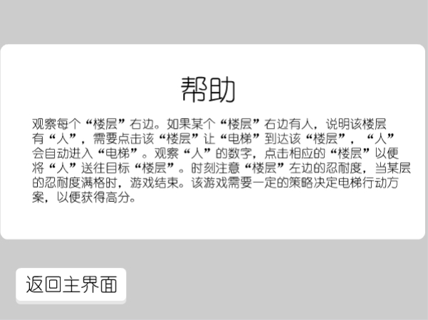 观察每个“楼层”右边。如果某个“楼层”右边有人,说明该楼层有“人”,需要点击该“楼层”让“电梯”到达该“楼层”,“人”会自动进入“电梯”。观察“人”的数字,点击相应的“楼层”以便将“人”送往目标“楼层”。时刻注意“楼层”左边的忍耐度,当某层的忍耐度满格时,游戏结束。该游戏需要一定的策略决定电梯行动方案,以便获得高分。