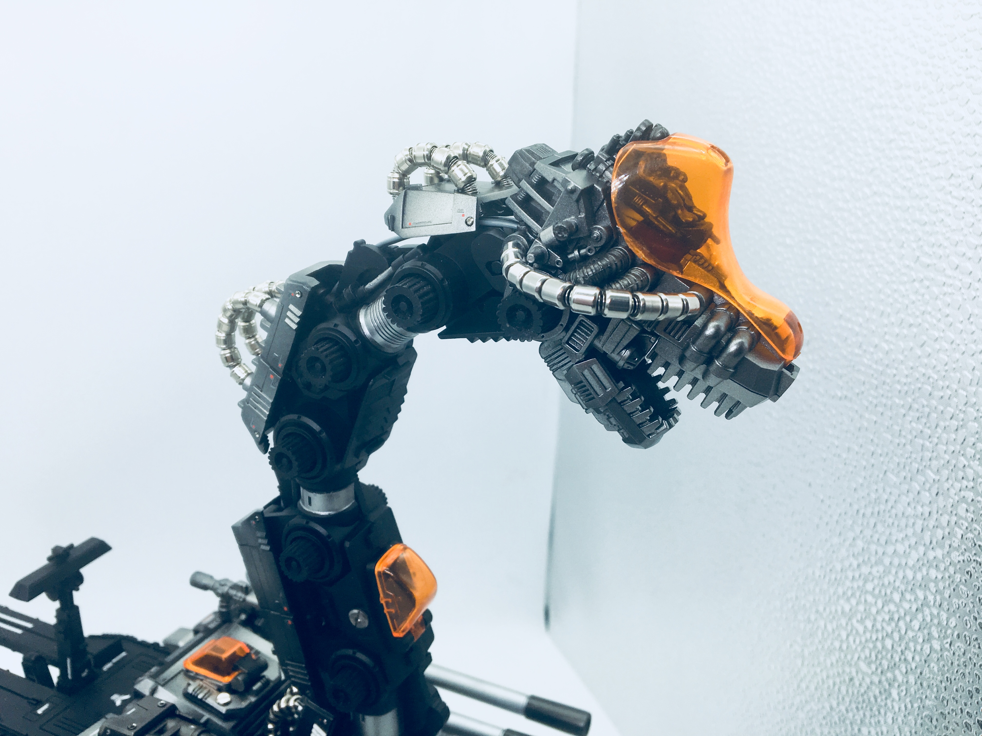 然后是各部分的细节图先是身体各部分的动力管都换成金属的,身上一些地方原来是一体无分件的地方也把动力管部分切掉换金属的,还有就是机体各部位追加细节。另外前脚的护甲换成了FA辉锤的配件包(这个才能护的住嘛)。