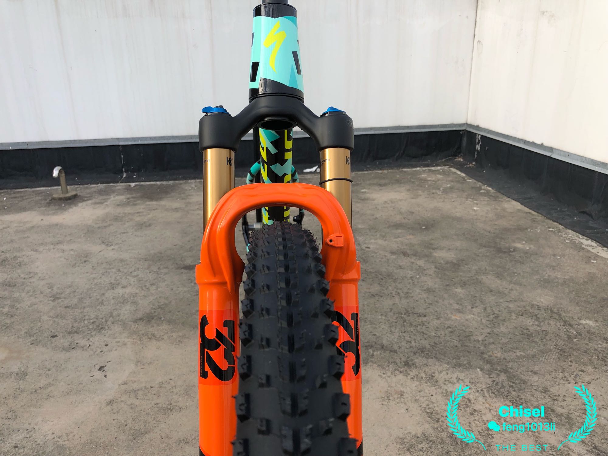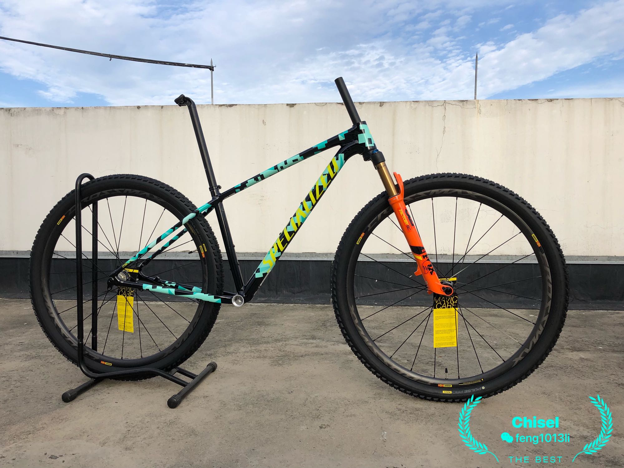 车架净重1440克(S码,不带腕组实测),29的boost规格FOX SC 32重1390克(截管前带桶轴杆实测),MAVIC 碳纤维轮组1458克(不含胎/胎垫,这个重量跟闪电roval control sl碳轮相当)