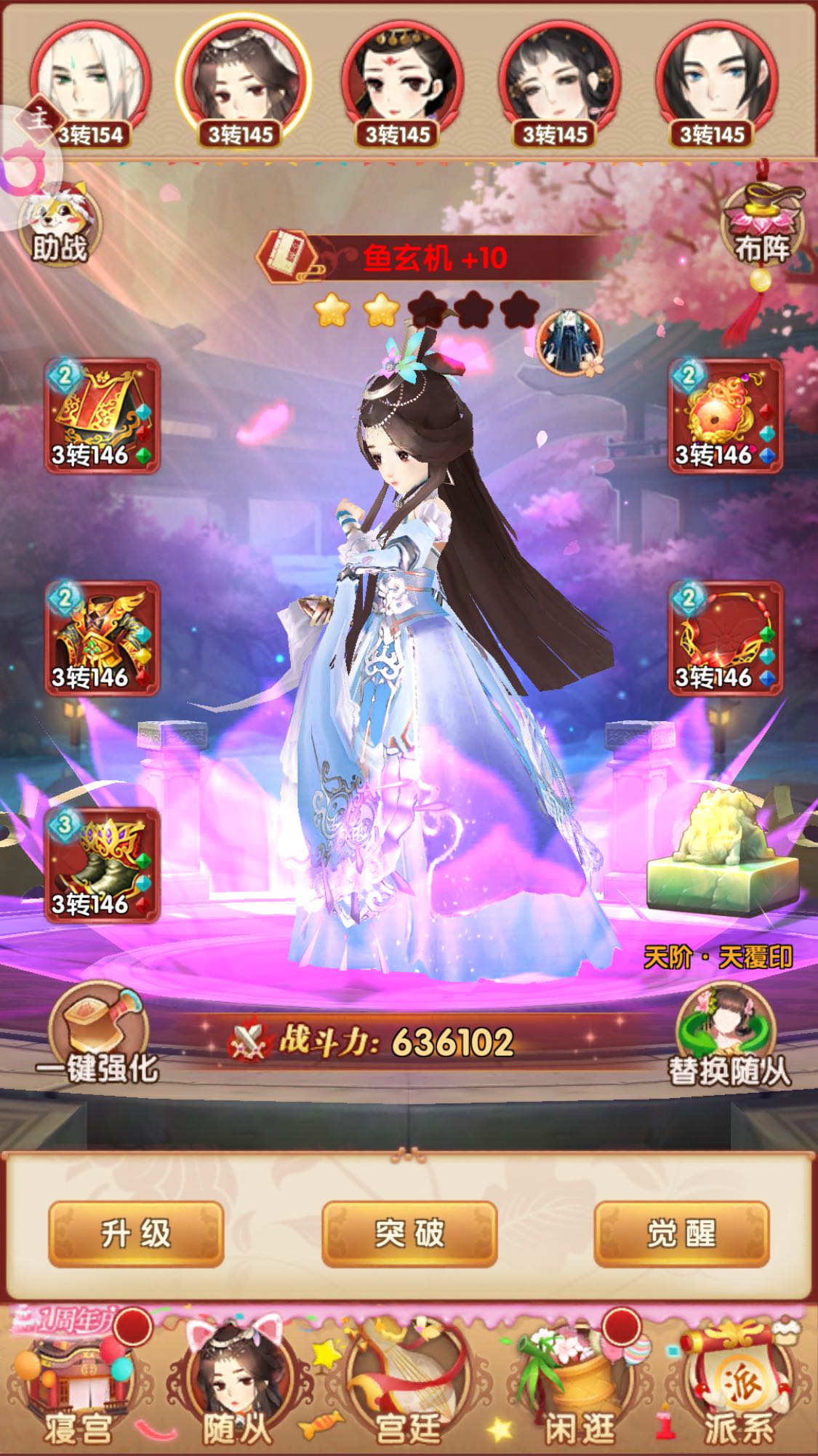 卫子夫、鱼玄机、亲王、主角、婉儿,速度这样试试,如果主角无法补刀,考虑换右侧堆点输出,另外加油把鱼突11然后觉醒