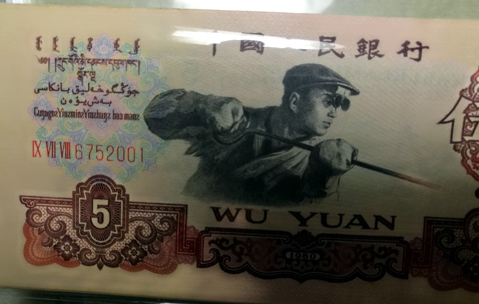 真正的碳黑版5元必需具备三个条件:1、三罗码(有具体的冠号),2、油性纸张,3、图案碳黑。尤其是这种油性纸张非常难得,它是由前苏联生产的,呈半透明状,纸质油润厚实。大家熟悉的背水和红三凸水印1角就是用的这种纸张,薄而坚实,韧性极佳,50连看上去一点厚。