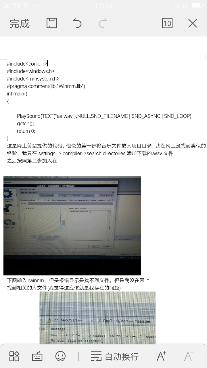 各位大神,我想用codeblocks写个程序播放音乐,但是查阅网上资料,发现要添加lwinmn库???还有添加文件到项目目录,小弟苦苦尝试未过,哭求前辈帮忙