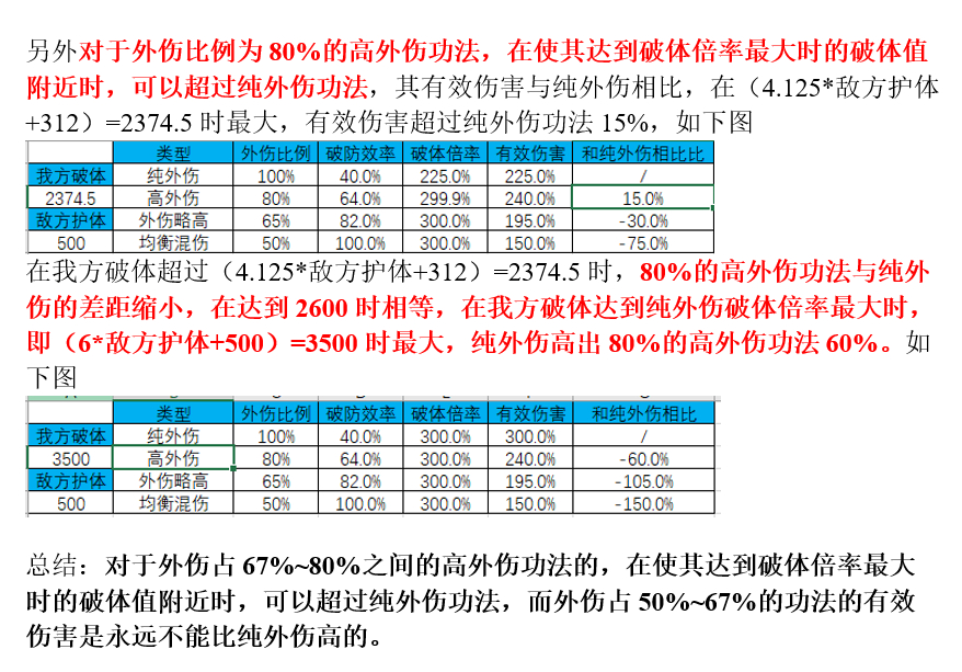 80%混伤并不是所有情况下都比纯伤弱,大约在你的破体/气比对手护体/气高出非常多的情况下(大概相当于在门派里打比自己低3阶左右的对手),80%混伤能比纯伤造成更大的伤害。