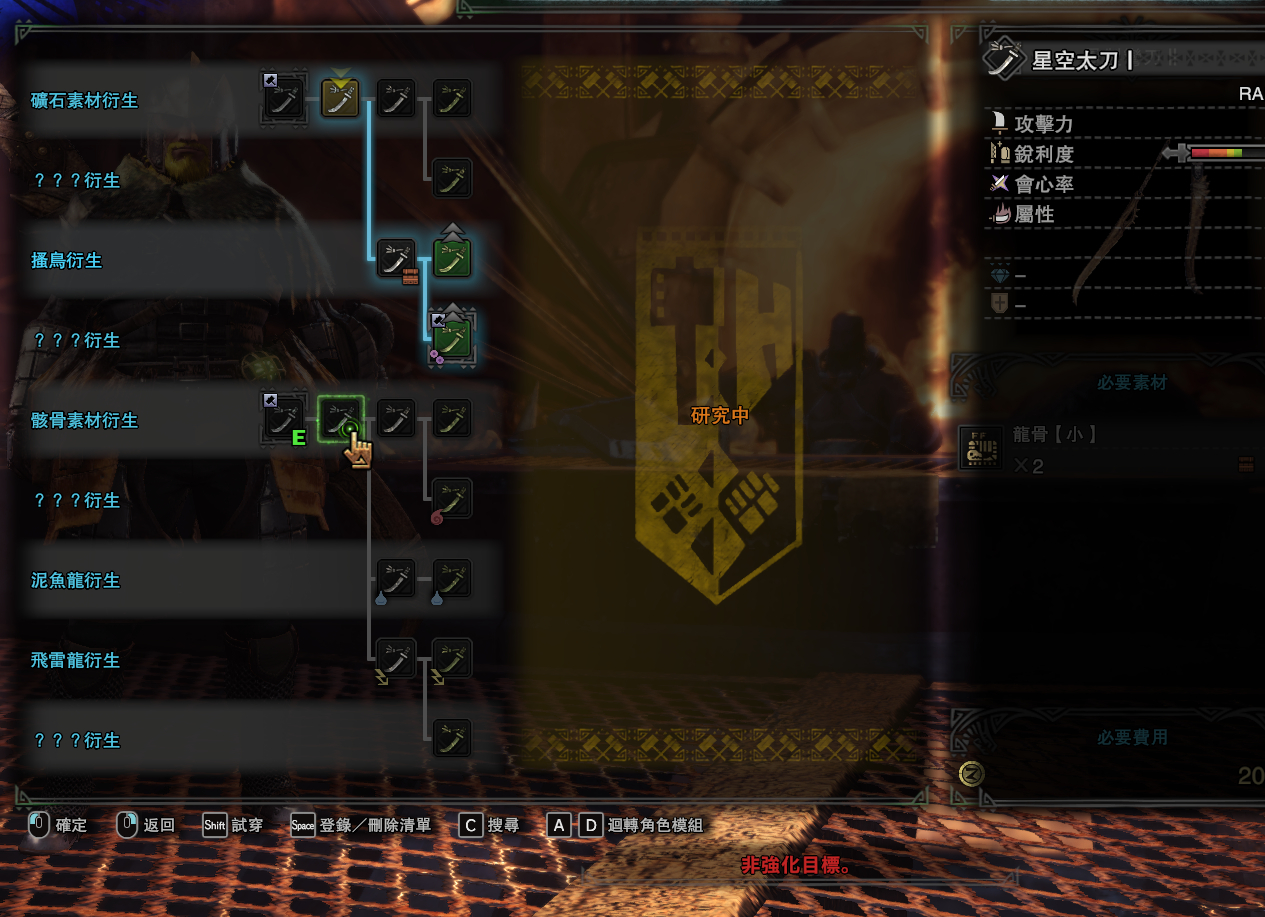 你选择这条路上的武器才能在这条路上强化啊,你选矿石武器要强化到骨系……看在你萌新的份子上就不玩过分梗了