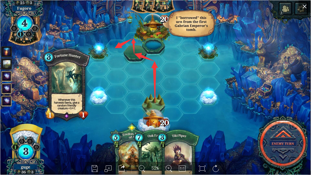 这样带来的结果是,对手可以用它的两个生物采它家两个井的同时,还能走过来合击你D1的生物,这是很不合算的,你可以用之前下在D2的生物借用对手铺在D1的地来打脸,但尽量别把地铺在D1