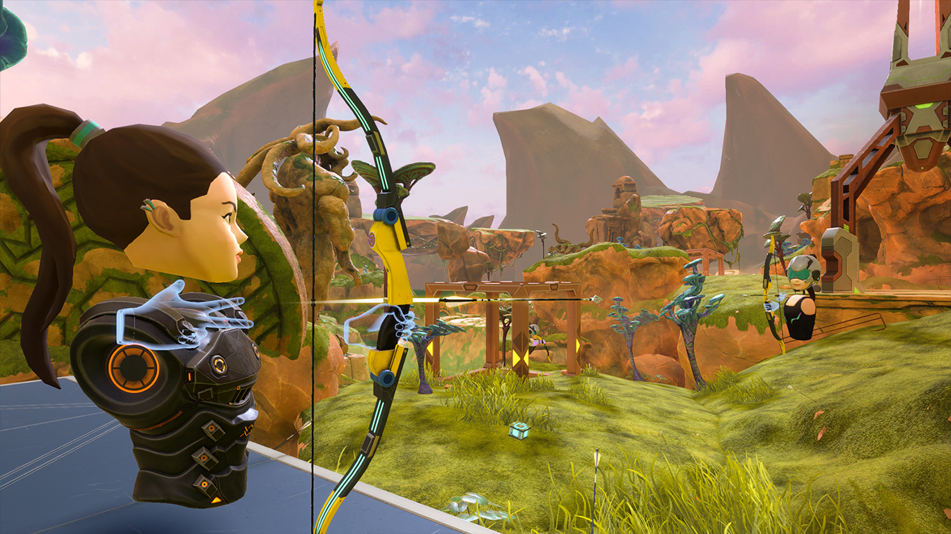 举个例子,如何移动一直是VR游戏中的一个棘手问题,因为场地限制,玩家往往需要通过手部打射线进行移动,而这往往与其攻击操作不能很好的融合,当玩家需要在攻击/移动操作中进行切换时,就使游戏节奏被打断或破坏。但是,在Walk on Arrow中,开发者采用了一种巧妙的方法来解决了这个问题。在Walk on Arrow中,当玩家按下右手Trigger键向后拉动弓弦并松开会射出一只对敌人造成伤害的普通箭,而当玩家按下右手圆盘向后拉动弓弦并松开则会射出一只爪钩箭并使人跟随爪钩箭一起飞行。这样玩家可以使用同一种操作即完成攻击也实现移动,从而在激烈战斗中不被打乱节奏。同时,更爽的是,当你移动到空中时,你还可以射出一只爪钩箭,再次进行移动。