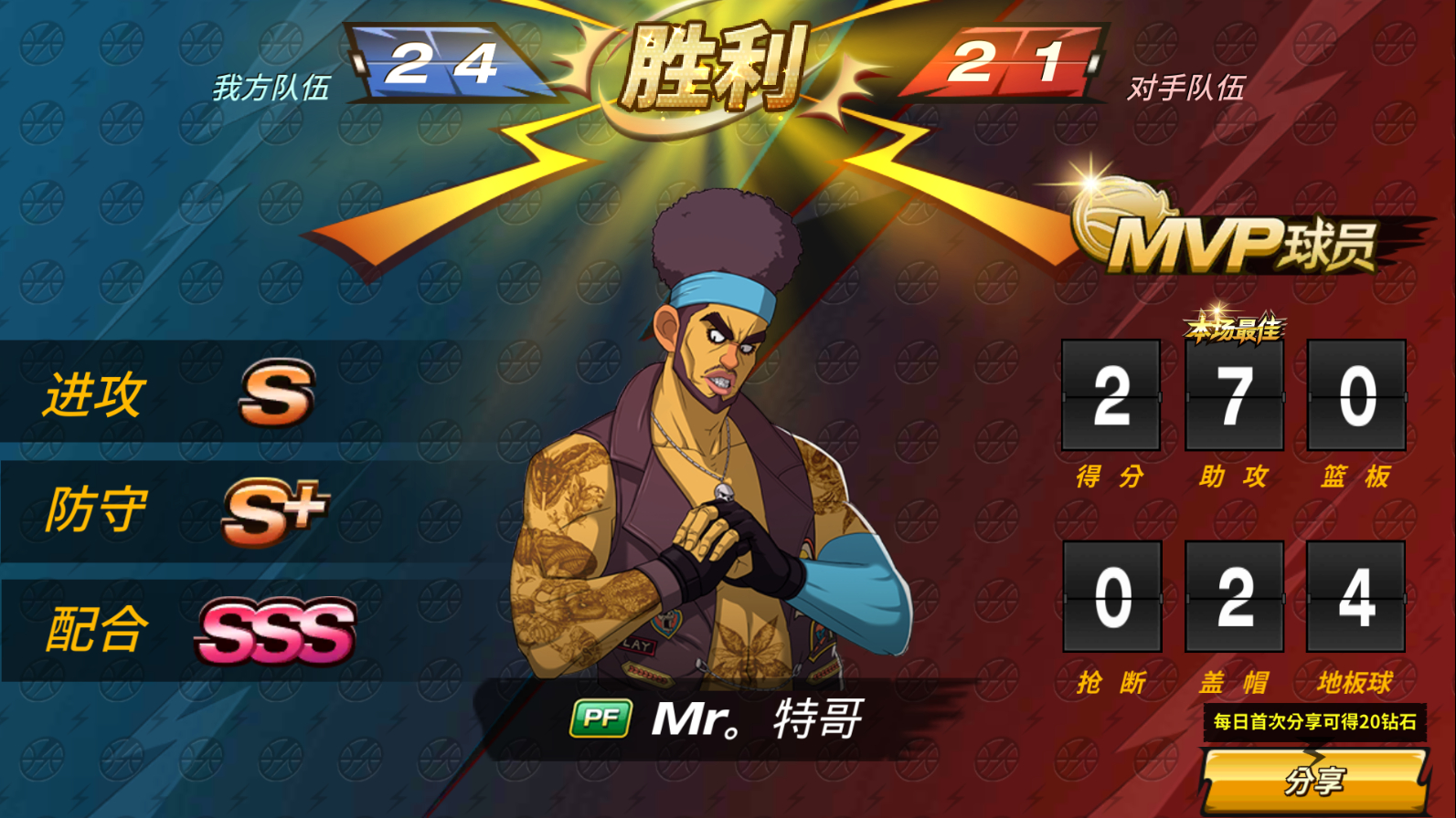 对面C的板很犀利!我那个是偷了个分球分歪了的。PF的灌篮估计上95+了吧。