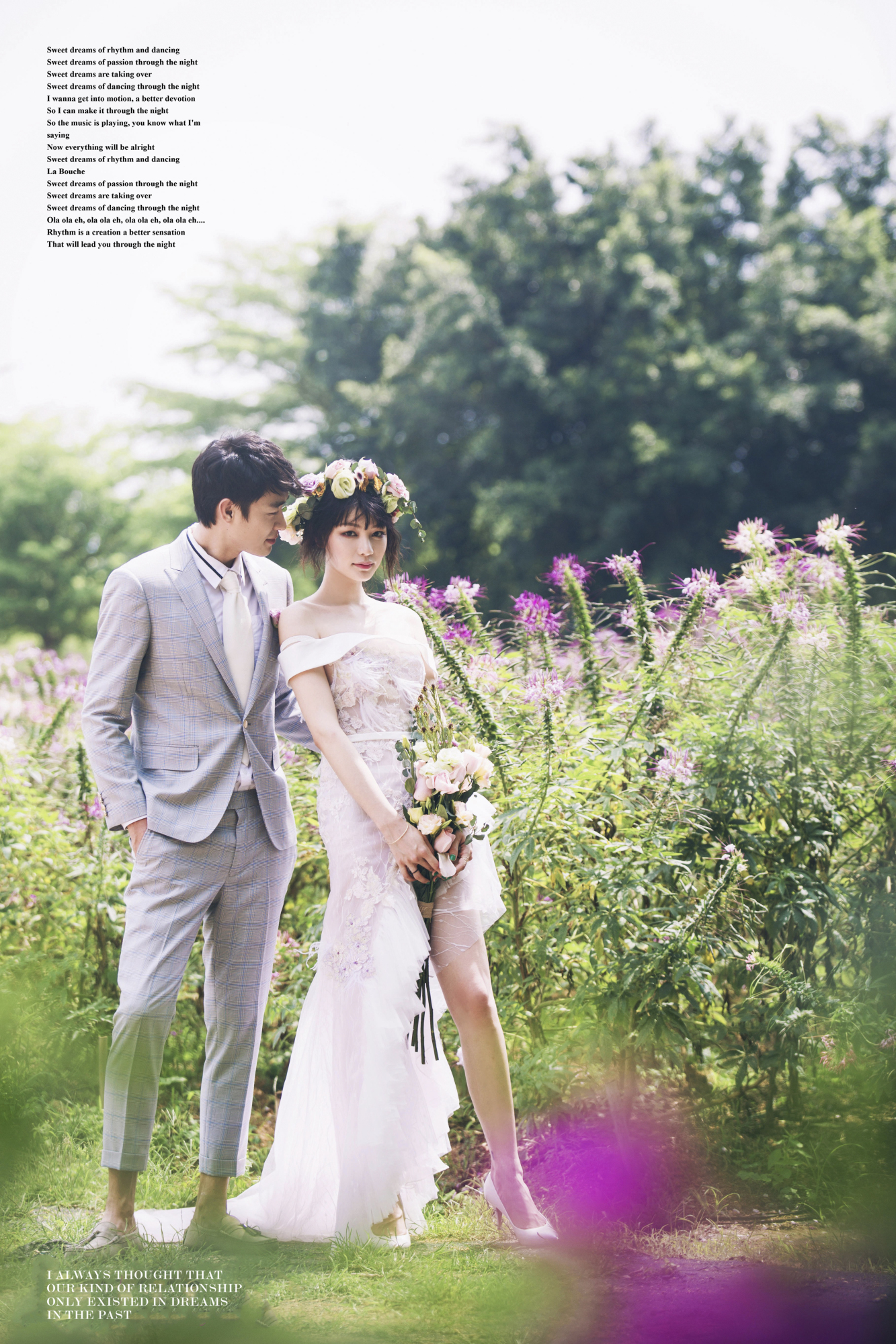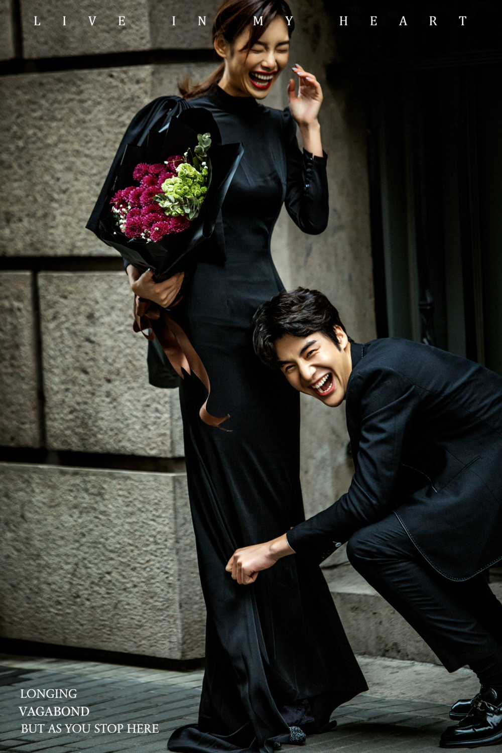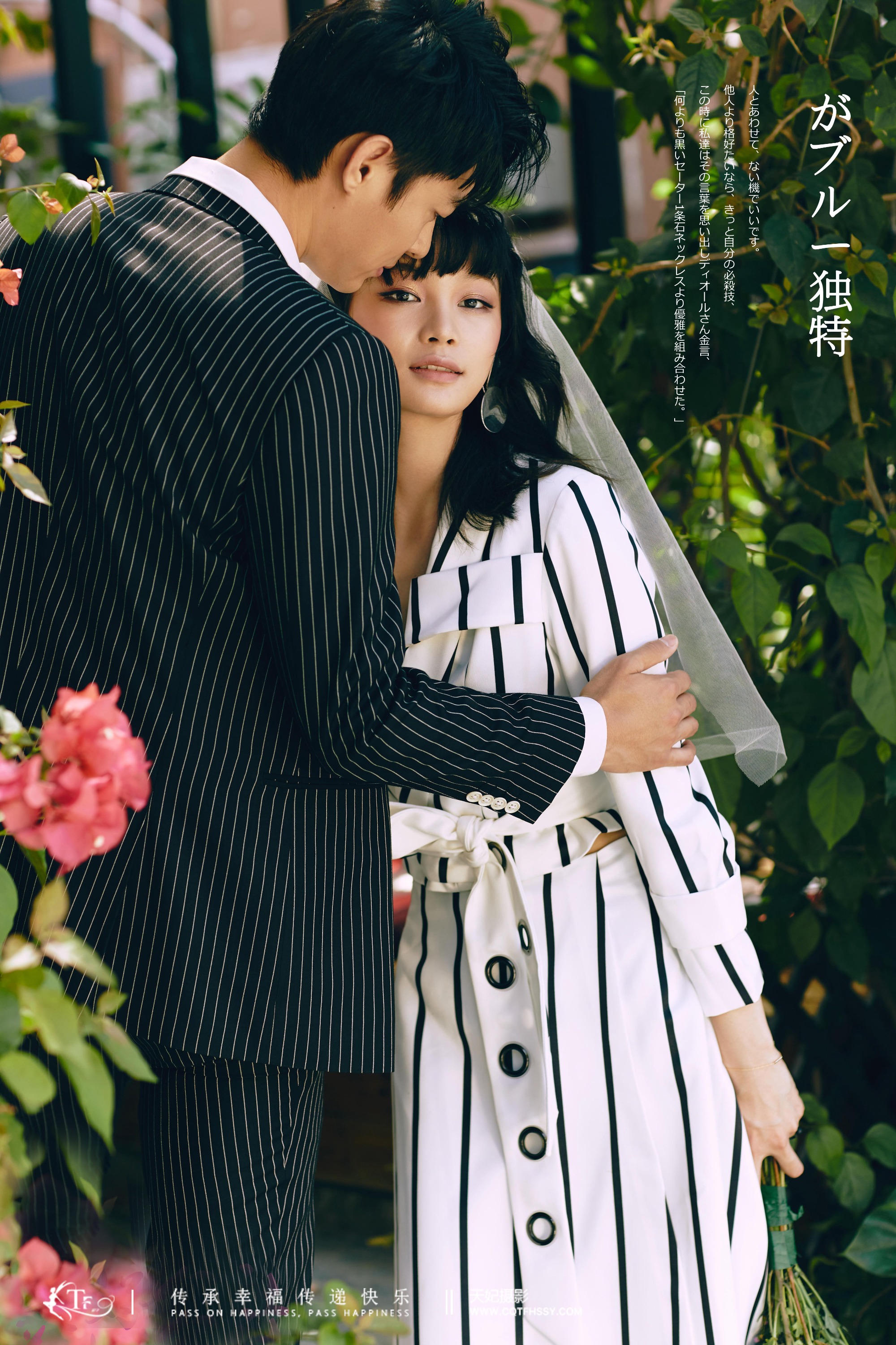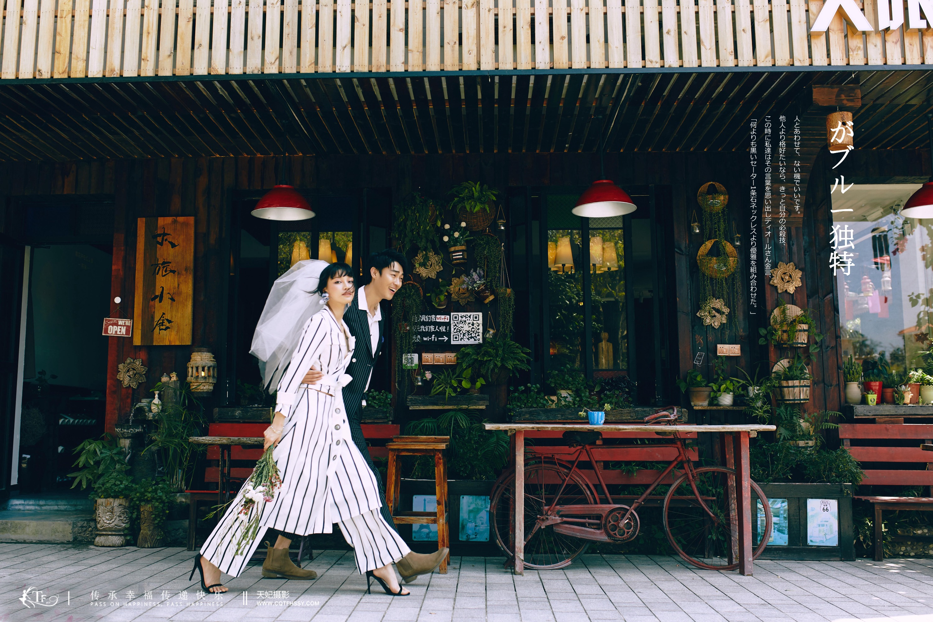 中式婚纱现在扩展了很多支线,一种是传统的龙凤袍,摆着古代标准的结婚礼仪,笑容温婉迷人;一种是混大了现代潮流服饰和道具,拍摄场景和动作或搞怪或痞气或高冷,这种改变为传统注入了新的风尚。