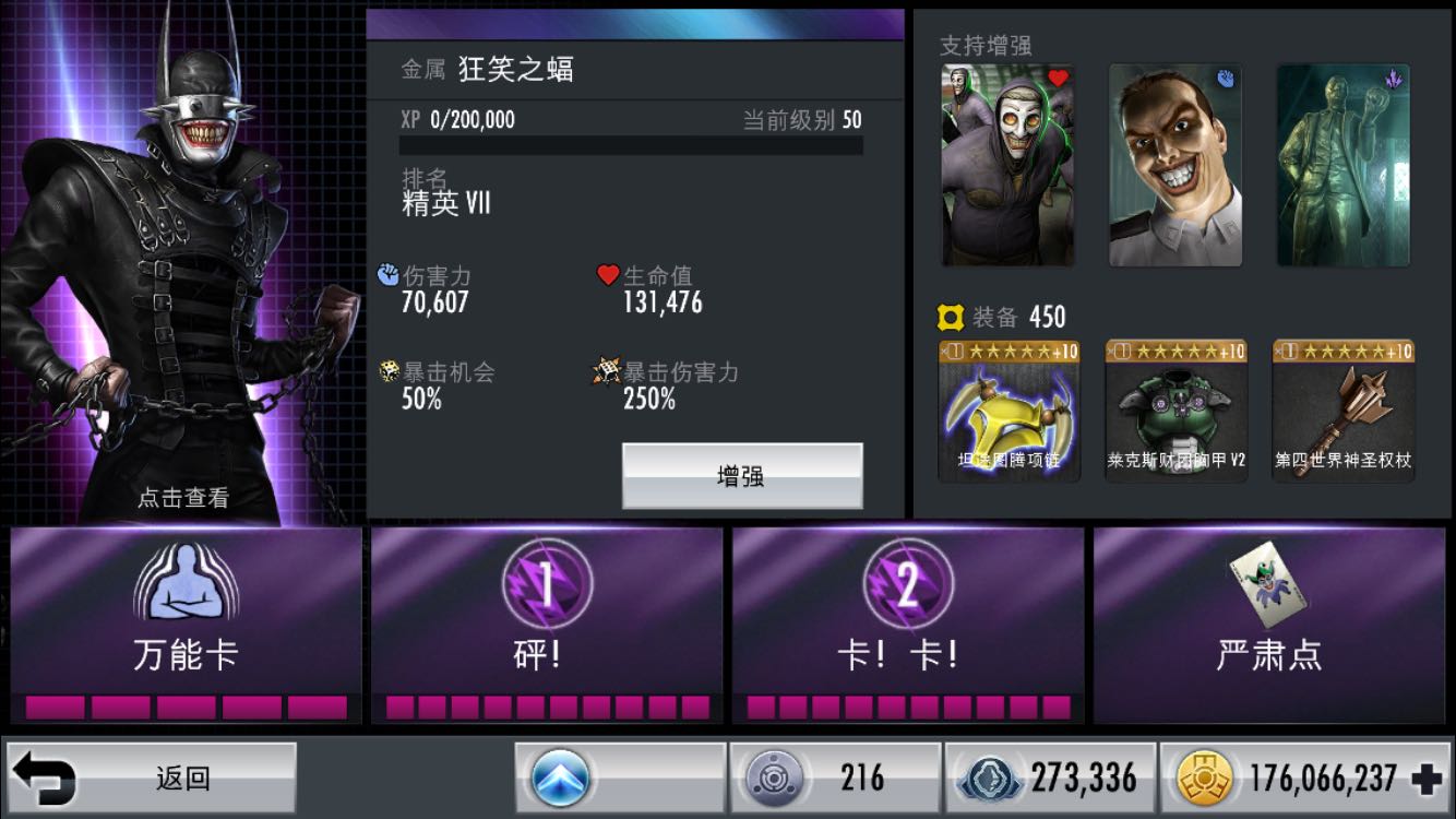 凭借吧友们的帮助,假设新卡的数据提升方式和原来的所有金卡一样,且精七五十级实验室满强化,计算出狂笑蝠的攻击和血量为121363和225990,无悯铁腕的攻击和血量为117448和233280,