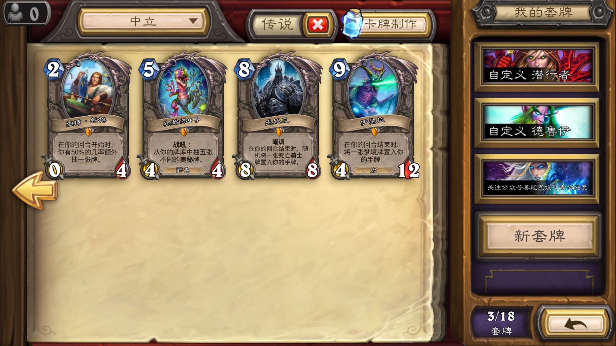 先去冰封王座冒险打个dk出来,没随机到猎dk就分卡合一个猎dk,做一套奥秘猎——这是标准计划