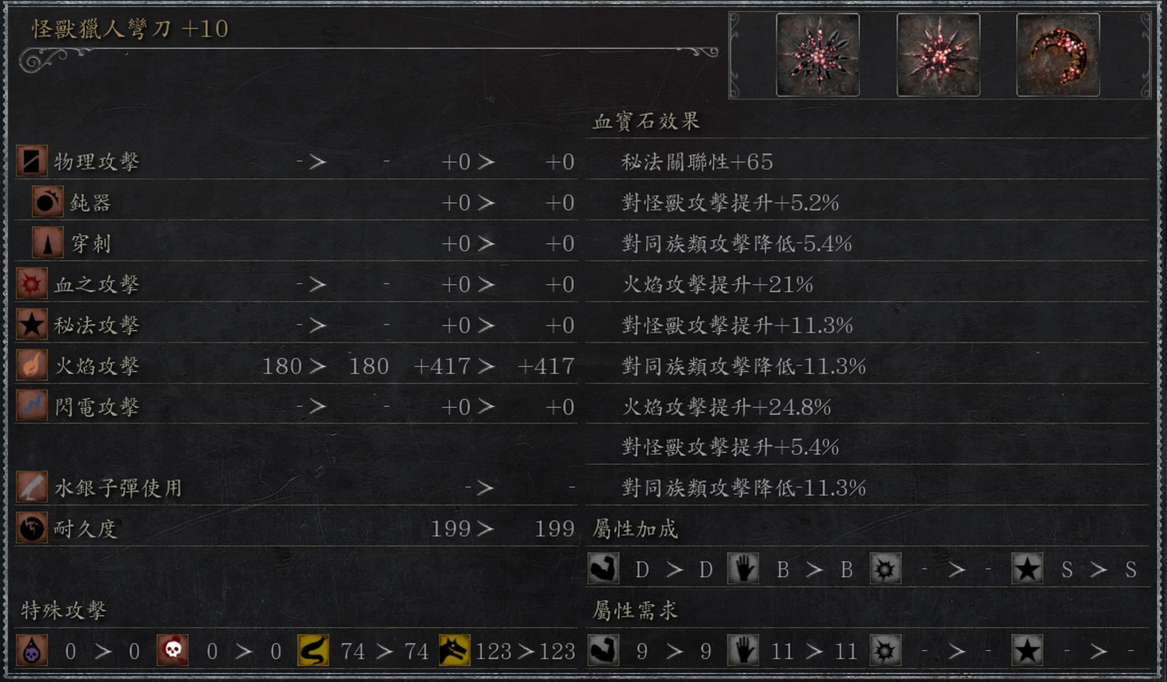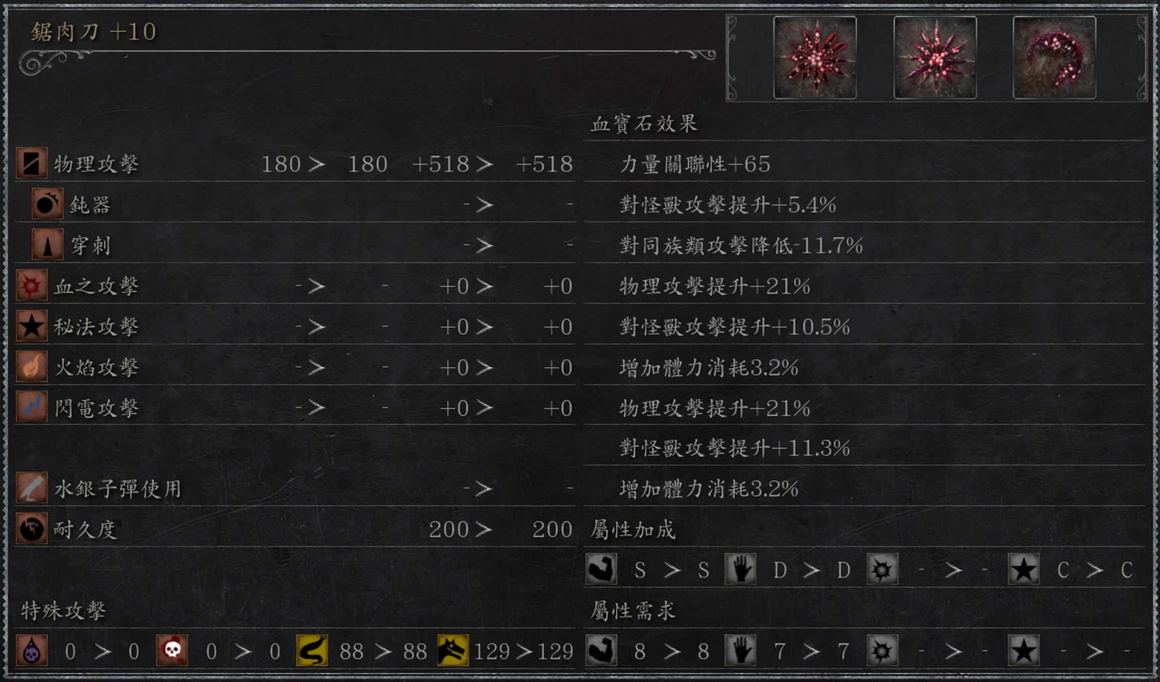 拿固伤和野兽测试了一下,背刺海飞丝,野兽锯肉刀蓄力r2是1686,固伤锯矛是1409,差距还是非常大的,大家自行权衡吧,我的秘法加点是73,仅供参考