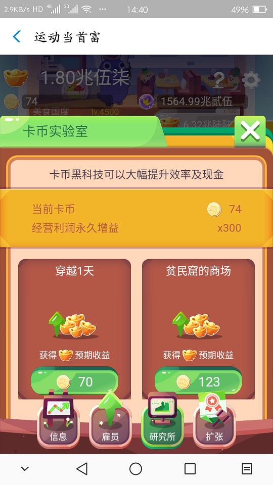 玩了快一个月,3天前刚解锁第15栋大楼魔都中心大厦,花了1.5天各种等灰机和商机把加速倍速刷到400x,然而一扩张发现把美食国度升到顶还等了一天之后竟然还没扩张前的收入高!!!扩张前穿越一天是144兆57左右的收入,扩张后变成了95兆57!原来一个商机给2.03兆57,现在一个才给8556兆56!原本攒了1.86兆26的声望,扩张后变成了1564.9兆25!也就是说——扩张后的加速倍数是扩张前的42%!!!已经等了1.5天,加速倍速还是1.0x。。。。。说好的400倍加速呢?切换2G/3G网络和Wifi重复购买店小二和营销没用,说好的每天0点随机刷新低级店小二和营销没出现。这**游戏真心让人玩不下去了