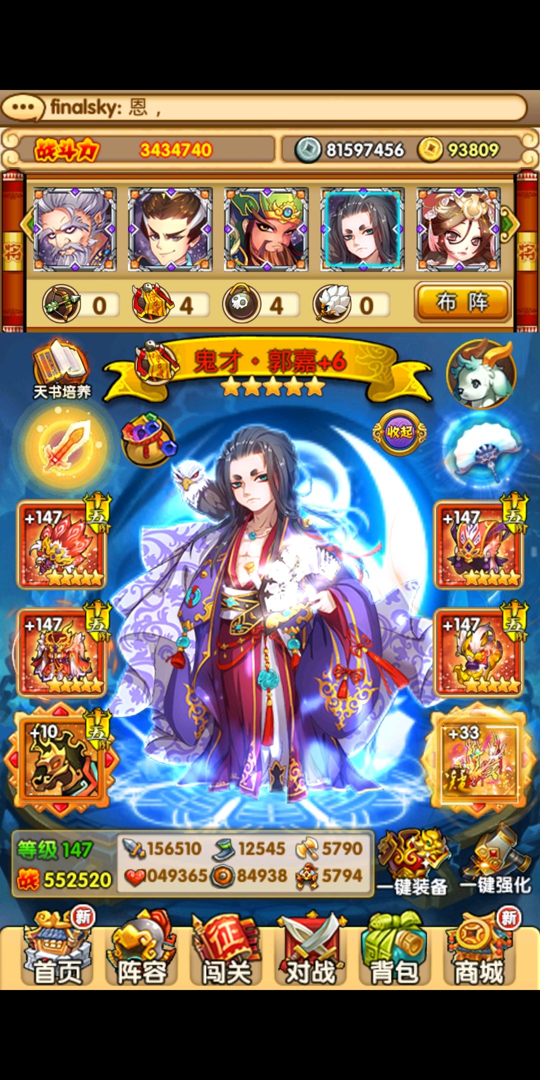 把装备全脱了,又重新穿上,战力少了很多,总战力,最强武将战力都少了