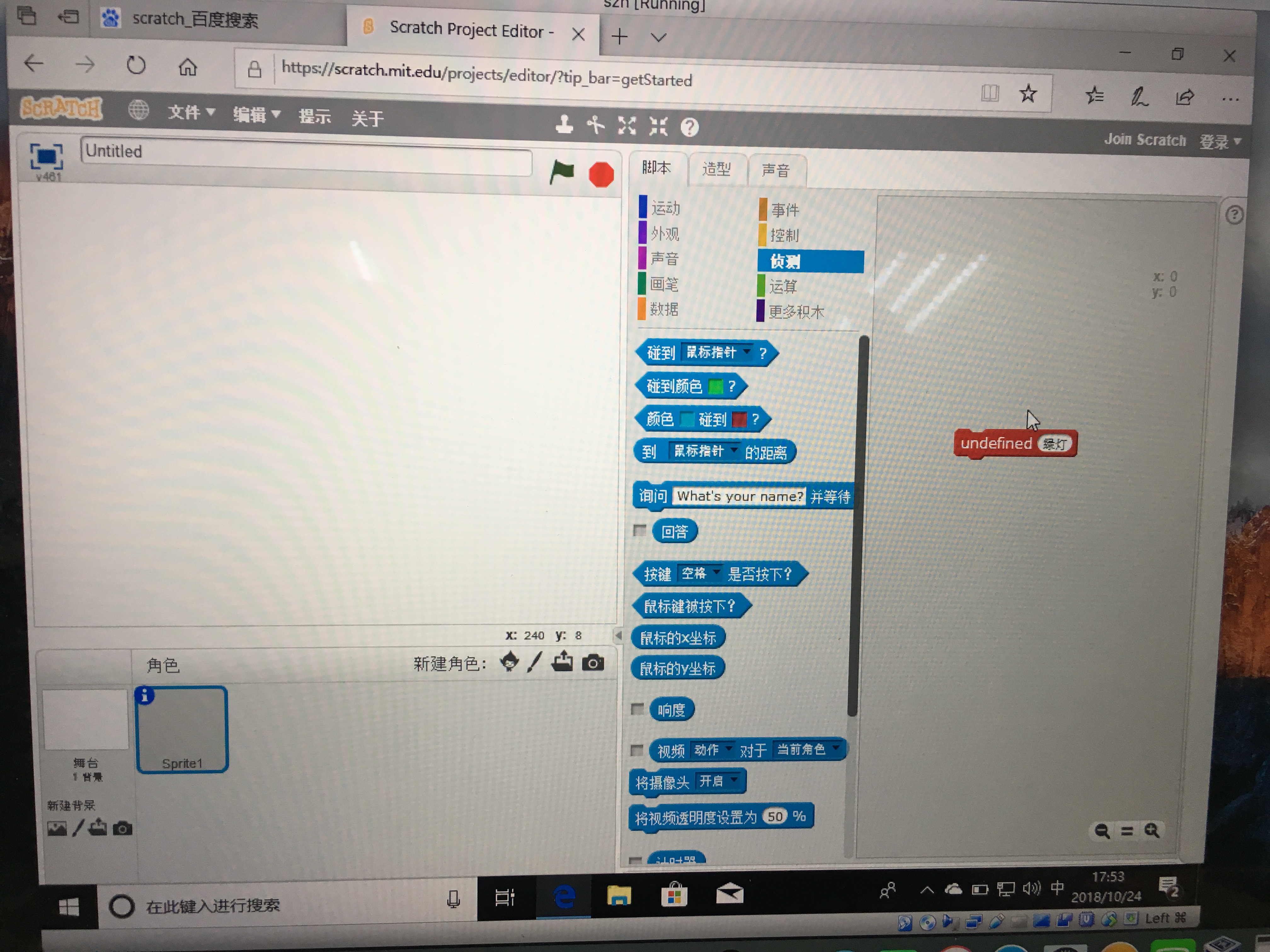 红灯,绿灯处原本内容是 touching:和_mouse_,改完再上传到scratch中显示如下