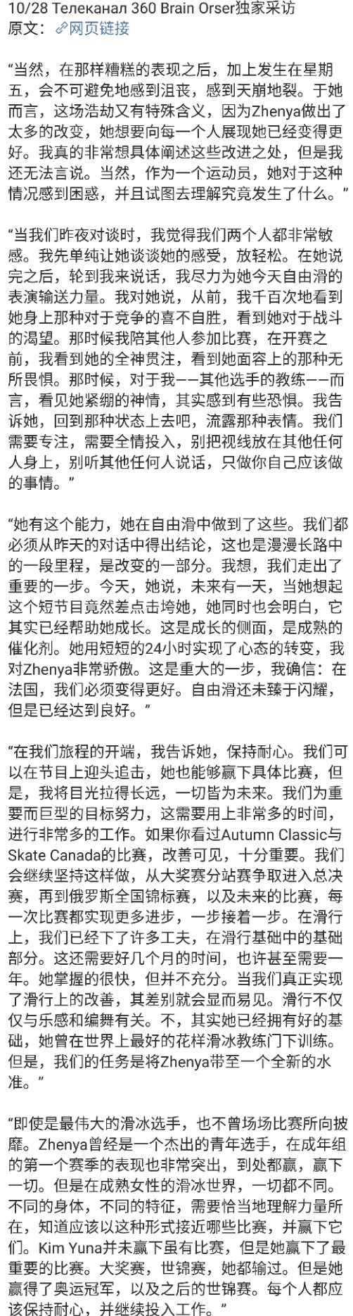 Brian Orser: Of course, after such a skate, as she had on Friday, you feel disappointed, devastated. For her, this devastation is special, because Zhenya made so many changes, she wanted to show everyone that she become better. She really wanted to show these improvements, but didn’t turn out. Of course, as an athlete, she was confused and tried to understand why this happened.