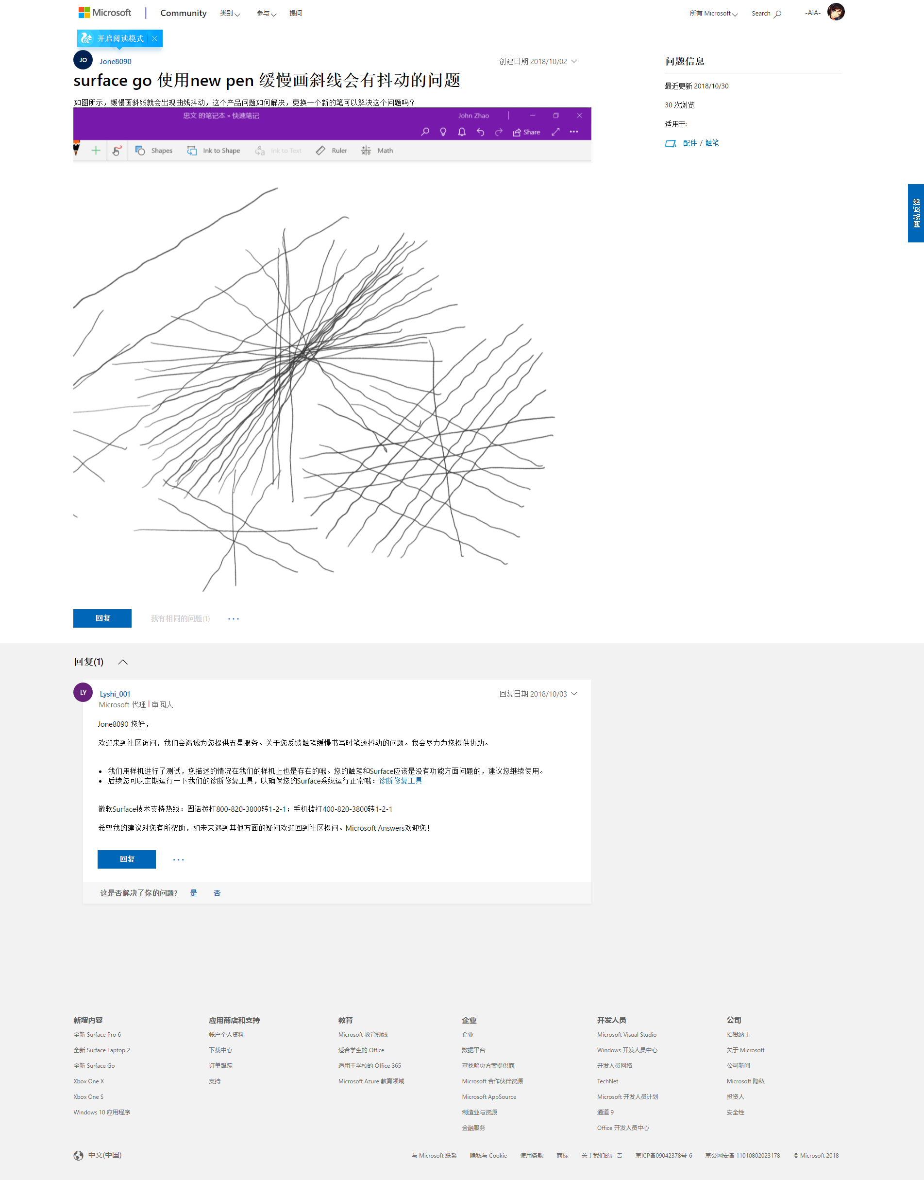 贴膜、没贴,徒手、用尺、surface pen、adonit ink,都试了都抖。然后发回给卖家,卖家用的四代笔,发给我的视频里是用软件的尺,还有一个实体尺快速画线不抖,旁边有略抖动的线(未录入录像)我要它们用实体尺慢速画,他们说下午重试。下午说没问题,但作特殊退款还是退了。所以我现在没surface go了