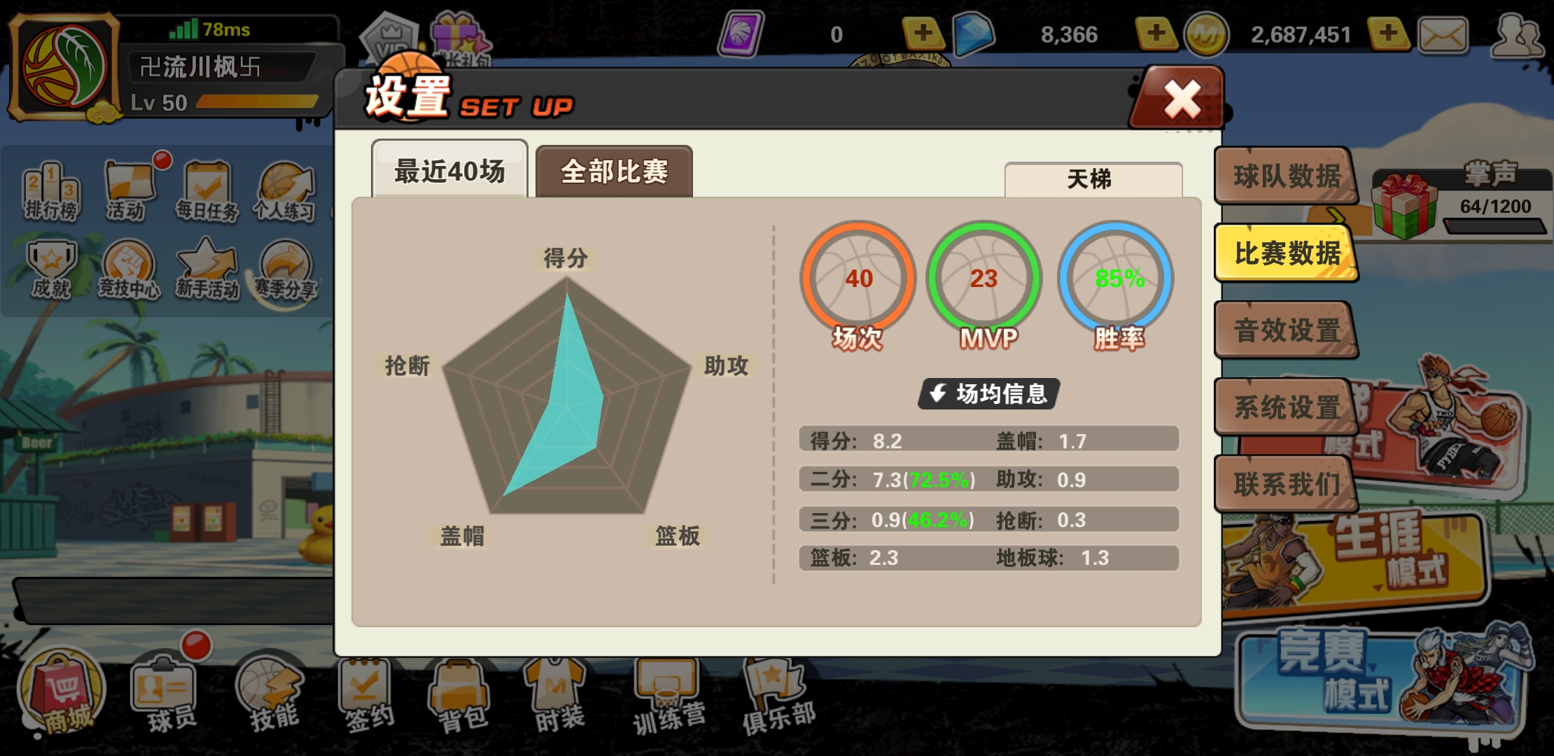 小号散装投篮跑动套424,跑动208篮板241,单排黄金段位纯大腿,240也能冲到板,白金段位以上靠分球和位置偷板,主打得分成功率,424基本就是一场空位铁一个,其他都能进,再往上就靠后卫传球意识好跑空位找机会还有内线有板有毛的大C帮擦屁股,其实越往上进攻成功率和盖帽越重要,篮板反而不是第一位了。。。