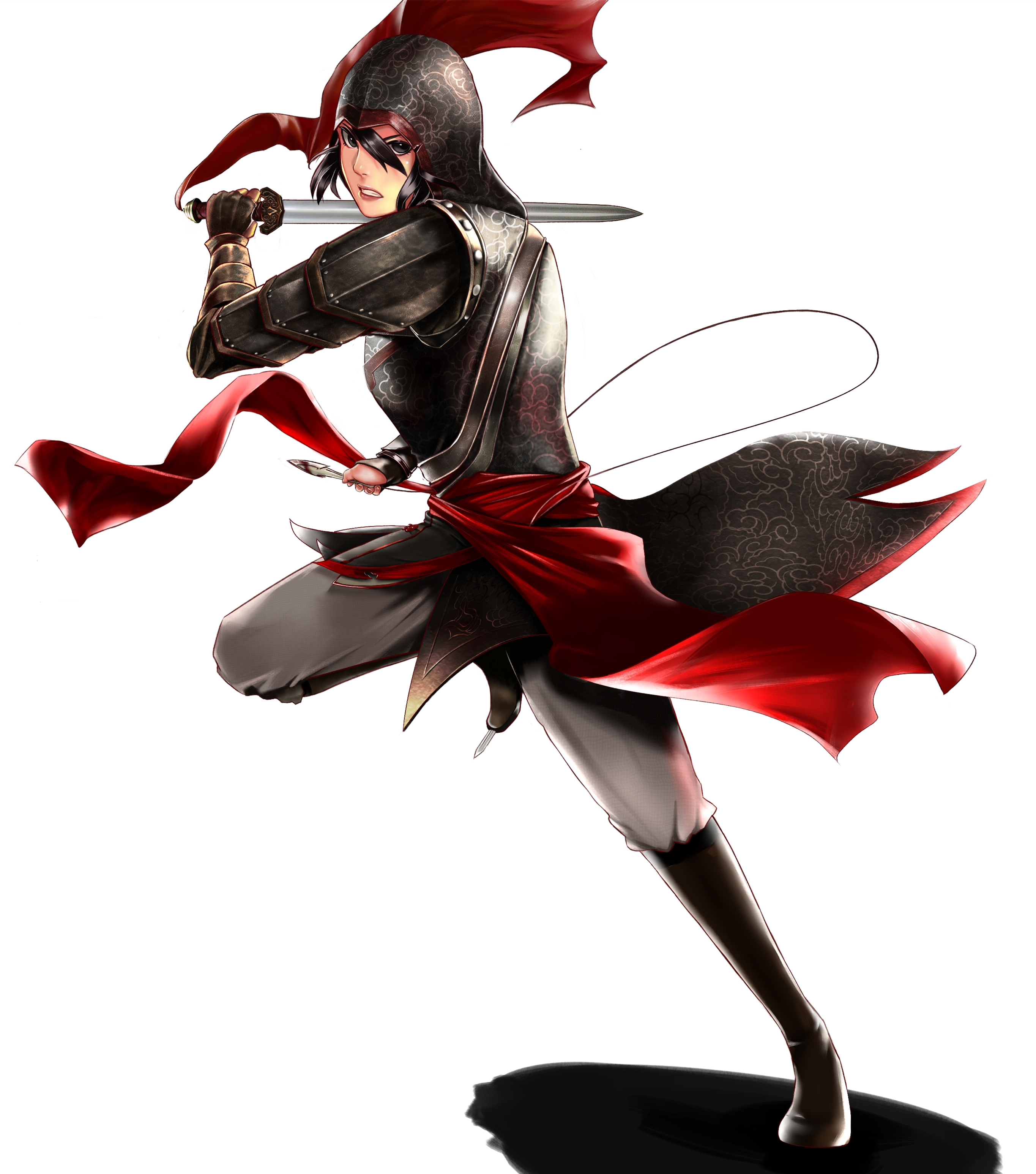 现在是感觉头和躯干割裂开来了,把头整体向右平移到躯干正上方,脖子画成竖的,两肩拉开一点,可能会好些。还有剑太长了。