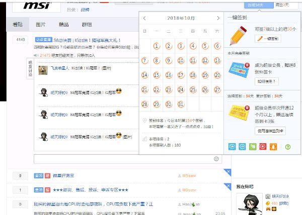 微星品牌吧共举办10月签到帖子活动、开吧活动,S8活动、还更新了微星拆机p、微星评测室、技术区三个栏目。
