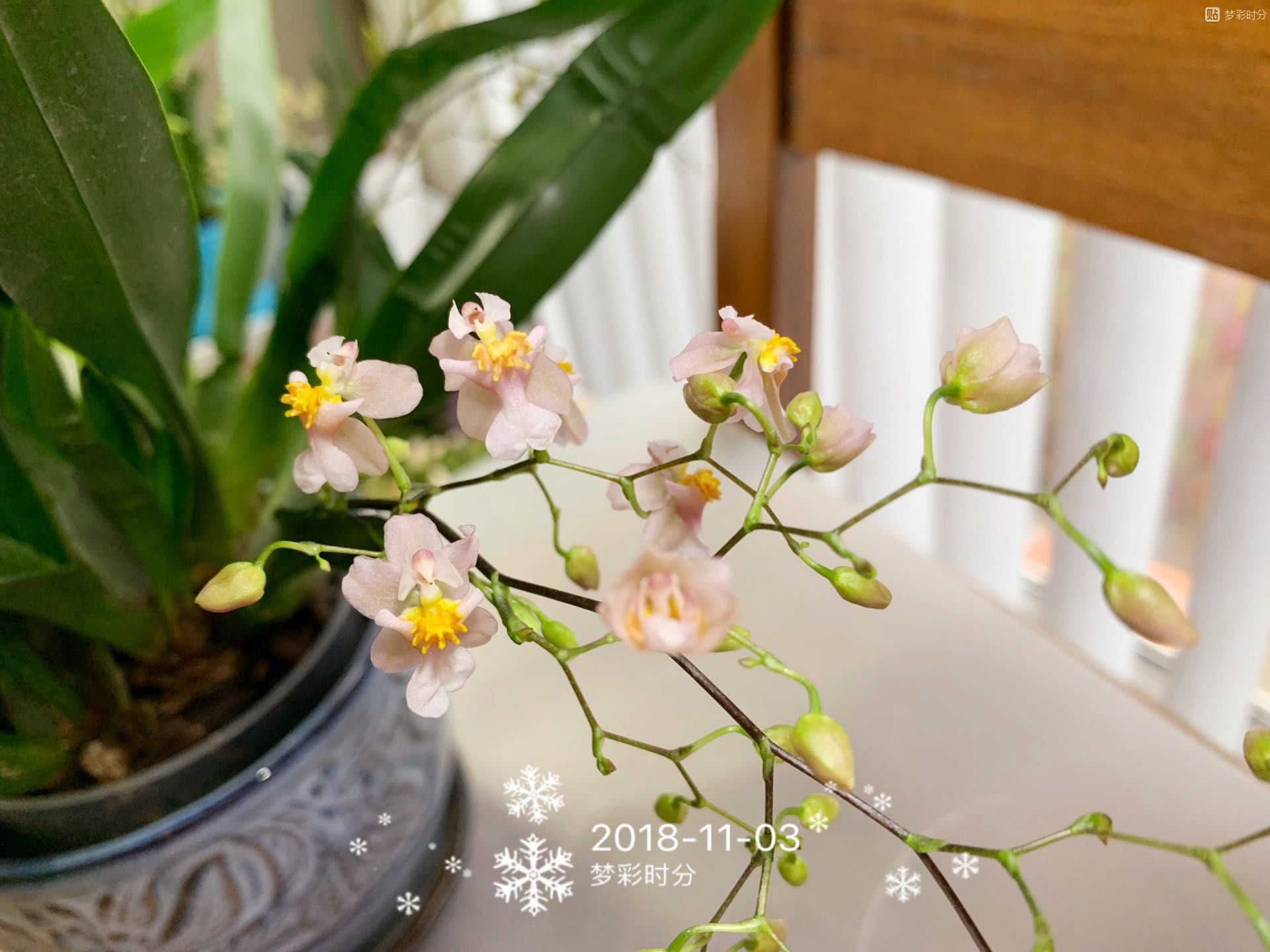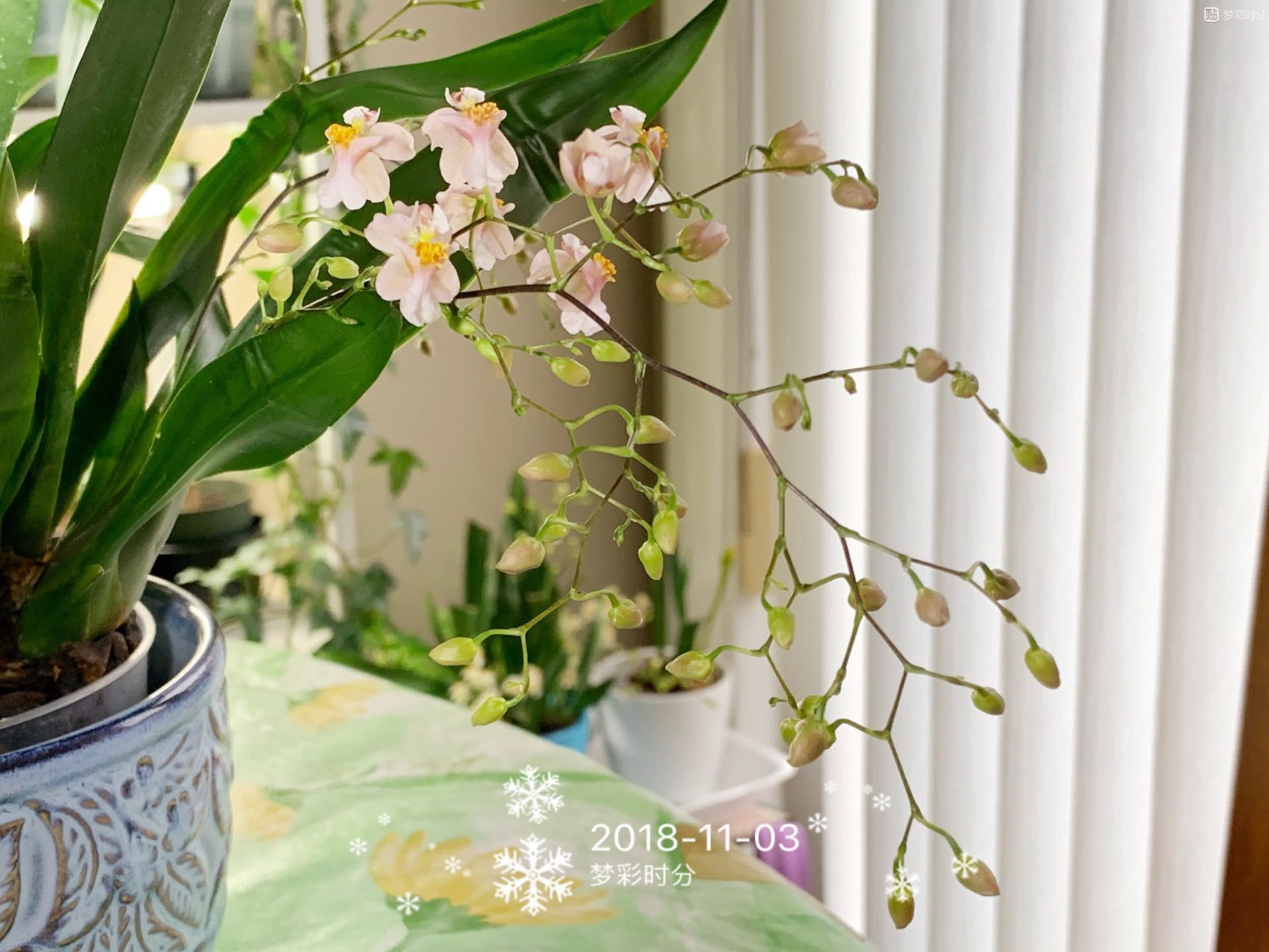 粉色的迷你文心兰也慢慢打开了几朵。这盆花抽的花箭很多,全部打