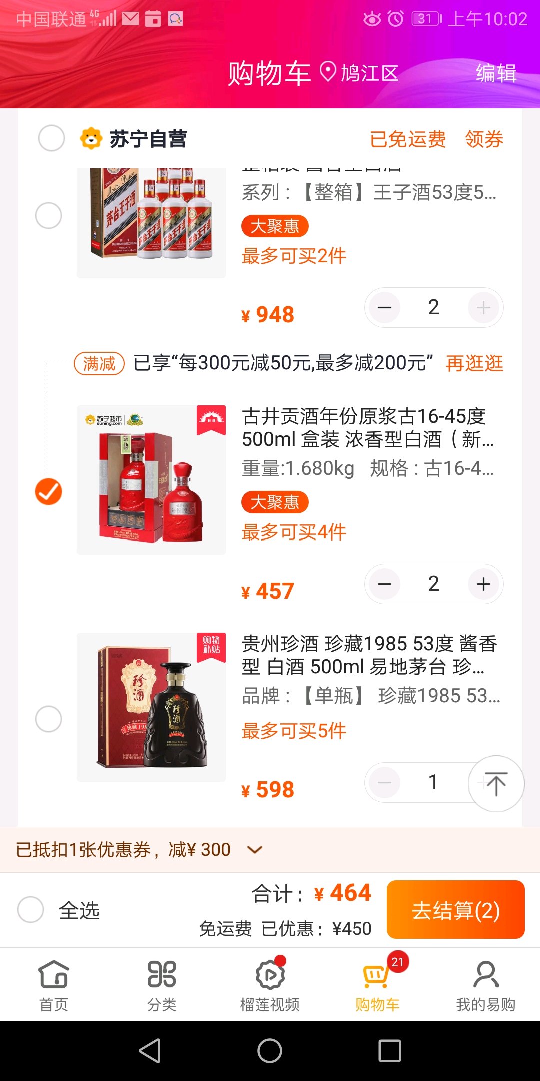 有个减300的卷,忘了啥时候的。但古井的卷多。多存防身