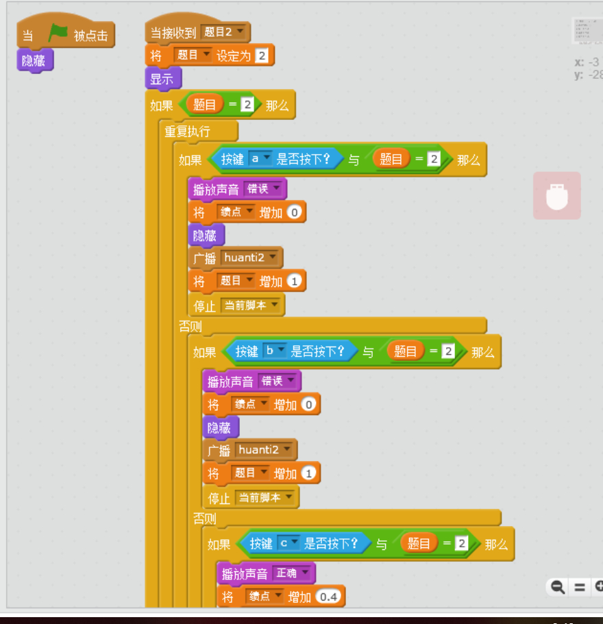 第一次接触sc,打算做一个答题游戏,但有很多问题。1.发现按下a和按下b的音效和我设计的是反过来的;2.答完题没有隐藏题目