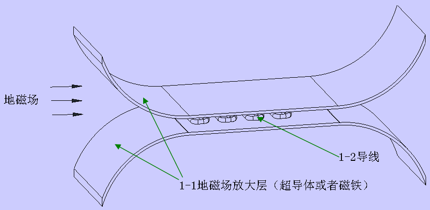 如图所示,图中1-1为地磁场放大层,可以是超导体,或者也可以是磁铁,通过改变地磁场的方向,使地磁场从上下两个放大层之间通过,放大层之间的地磁场被放大增强,在此区域放置导线。图中1-2为导线,具体如第3图和第4图所示,弯曲的导线,其中一个方向的导线被屏蔽,这样导线总体产生的推动力就不会被抵消。