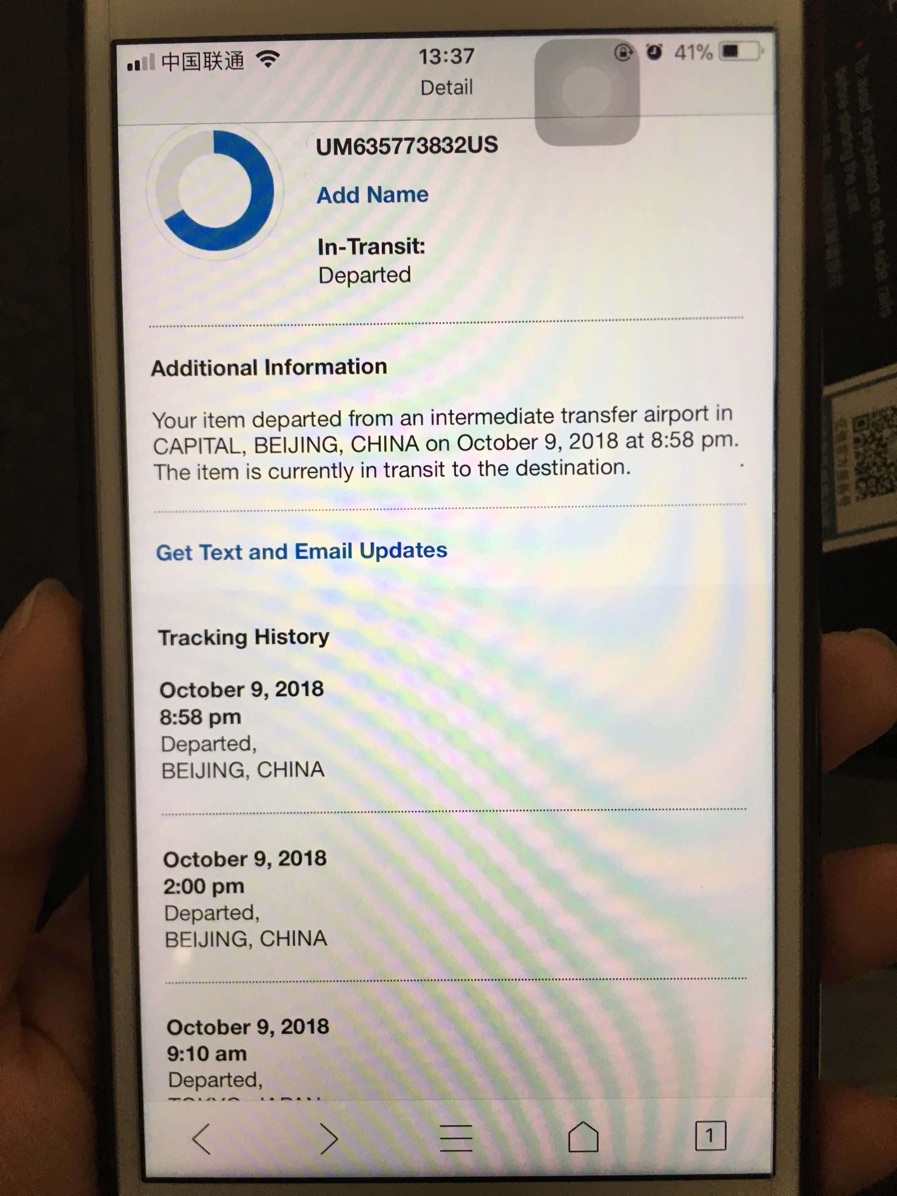 我跟你一样,我的显示10月4号离开北京,就没信了