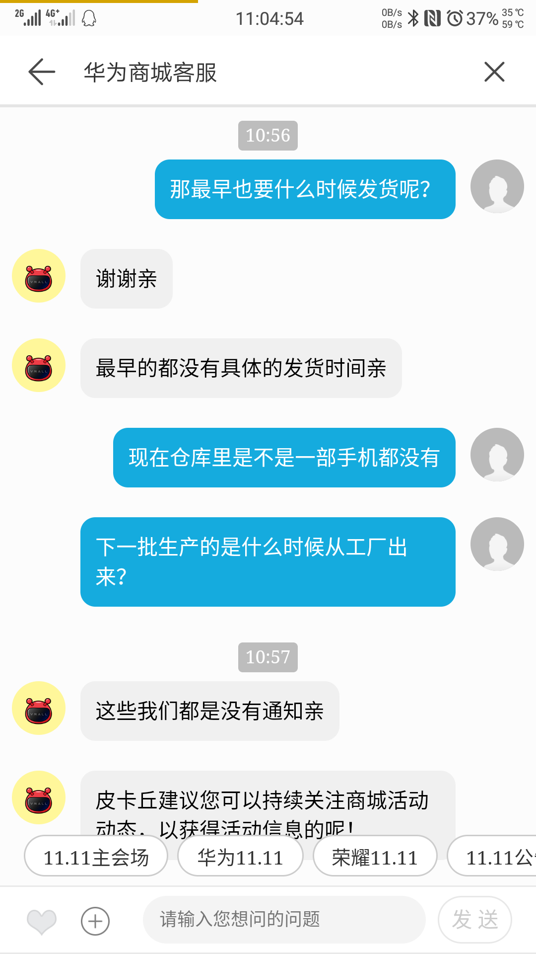 每次都说,现在库存紧张,导致您的订单会延迟发货,包括但不限于12月11号前能发货,建议您退款,作为补偿,我们会按照你的订单地址给你补偿100元的小礼品,就这之类的话。我没同意,怼回去了。