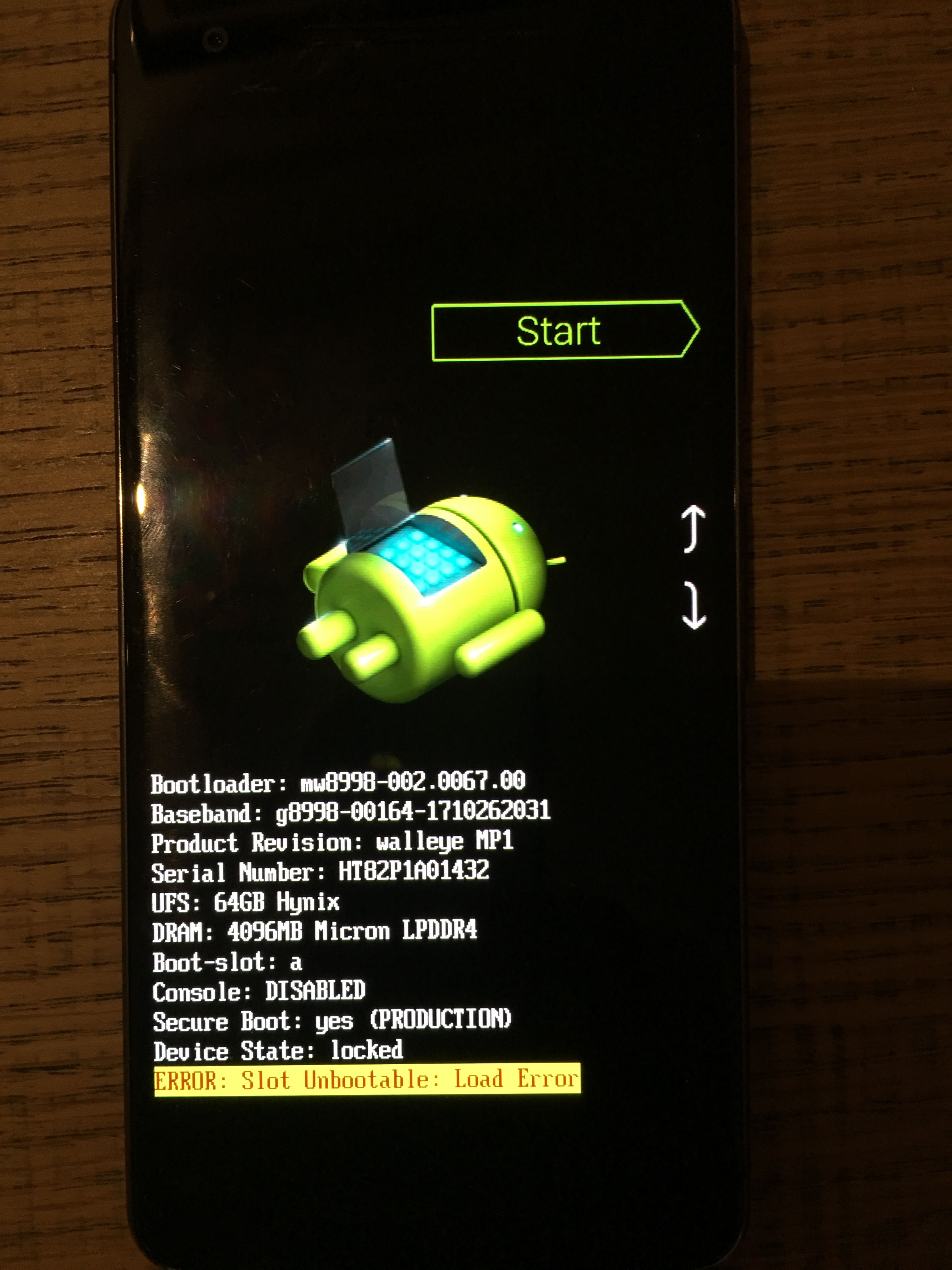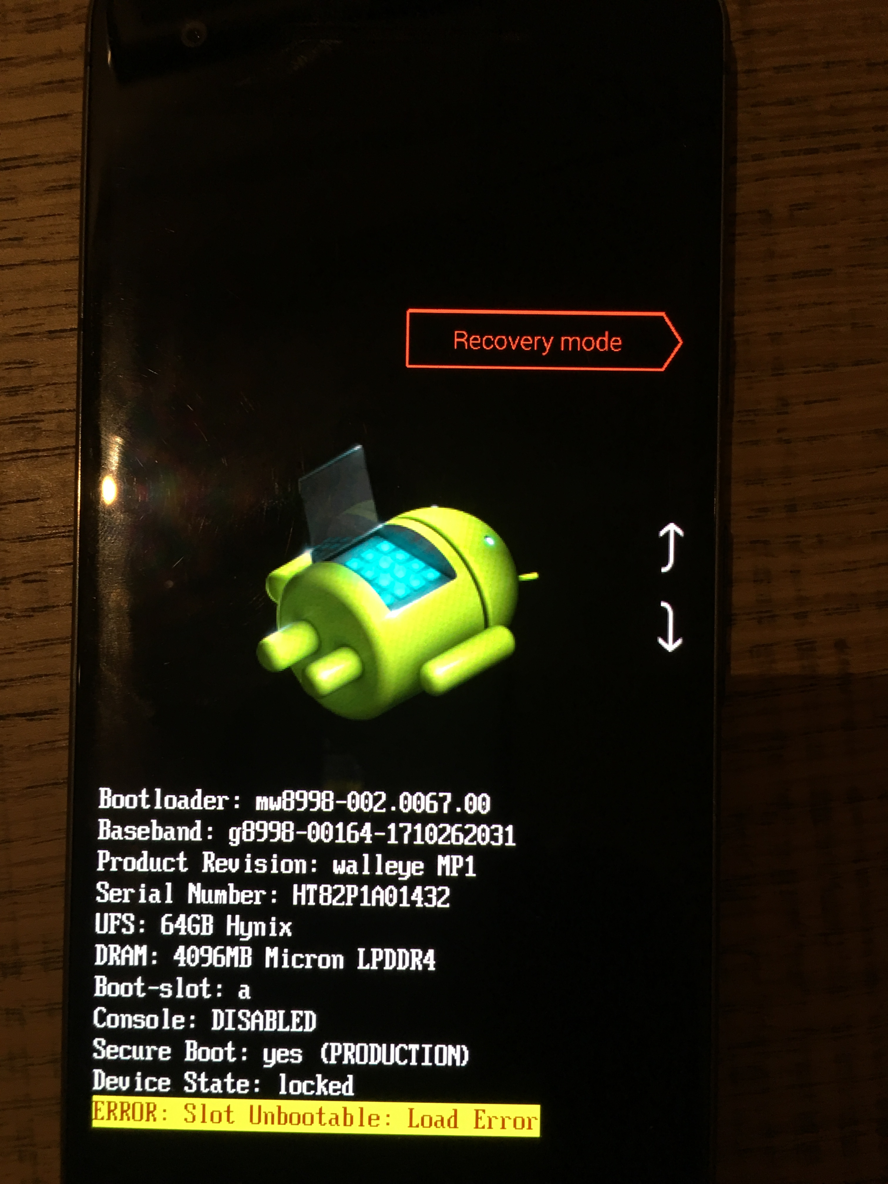 昨天pixel2开机后,突然就变成下图这个状态。 而且无法进入recovery mode(选择recovery,按下开关键,3秒后,回到图一界面)