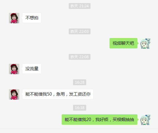 楼主在探探附近加到一个女的,要微信之后一直聊啊,随便聊聊,然后跟我说手机没流量了 。那行,想让她怕张照片或者视频聊天聊天确认一下,确一直拒绝。