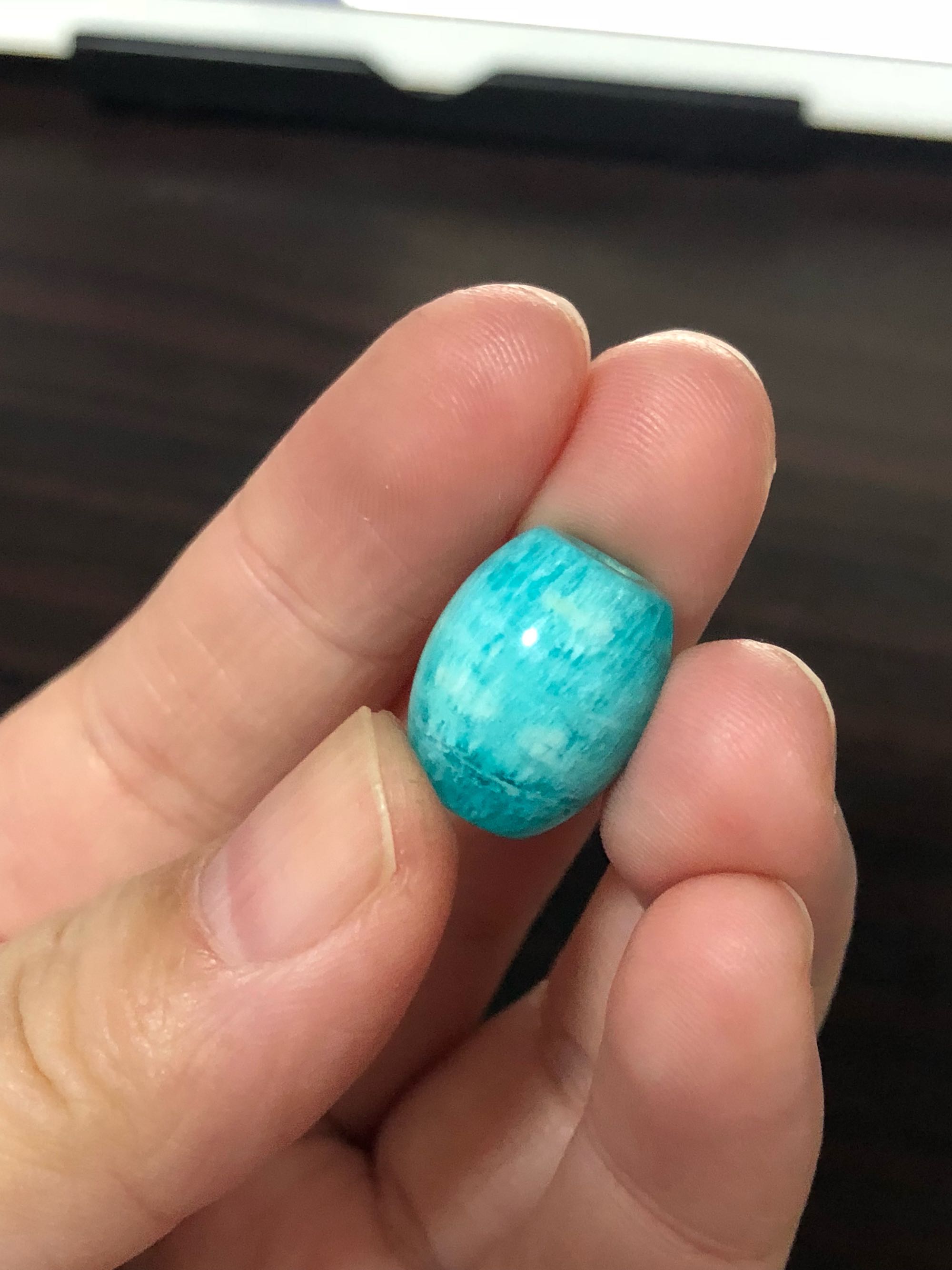 天河石桶珠一枚,尺寸忘了,不小,有意我回去量量