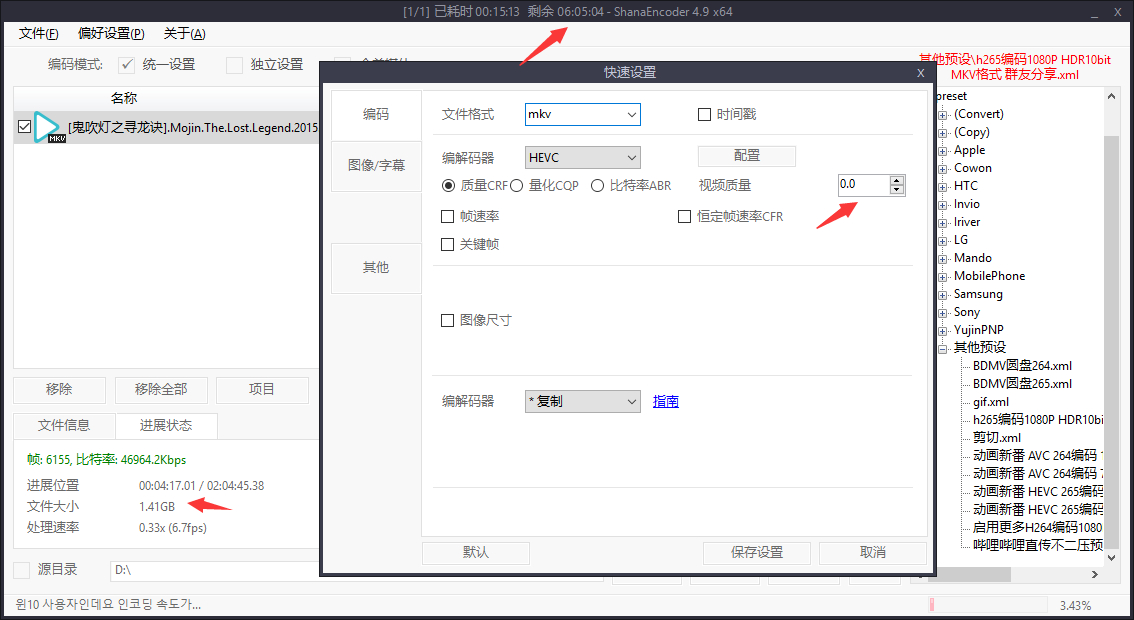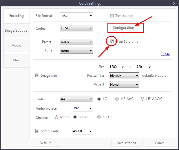 Encoding settings : cpuid=1111039 / frame-threads=4 / wpp / no-pmode / no-pme / no-psnr / no-ssim / log-level=2 / input-csp=1 / input-res=1920x1080 / interlace=0 / total-frames=0 / level-idc=51 / high-tier=1 / uhd-bd=0 / ref=3 / no-allow-non-conformance / repeat-headers / annexb / no-aud / no-hrd / info / hash=0 / no-temporal-layers / open-gop / min-keyint=24 / keyint=250 / gop-lookahead=0 / bframes=4 / b-adapt=2 / b-pyramid / bframe-bias=0 / rc-lookahead=20 / lookahead-slices=6 / scenecut=40 / radl=0 / no-intra-refresh / ctu=64 / min-cu-size=8 / no-rect / no-amp / max-tu-size=32 / tu-inter-depth=1 / tu-intra-depth=1 / limit-tu=0 / rdoq-level=0 / dynamic-rd=0.00 / no-ssim-rd / signhide / no-tskip / nr-intra=0 / nr-inter=0 / no-constrained-intra / strong-intra-smoothing / max-merge=2 / limit-refs=3 / no-limit-modes / me=1 / subme=2 / merange=57 / temporal-mvp / weightp / no-weightb / no-analyze-src-pics / deblock=0:0 / sao / no-sao-non-deblock / rd=3 / no-early-skip / rskip / no-fast-intra / no-tskip-fast / no-cu-lossless / no-b-intra / no-splitrd-skip / rdpenalty=0 / psy-rd=0.00 / psy-rdoq=0.00 / no-rd-refine / no-lossless / cbqpoffs=0 / crqpoffs=0 / rc=crf / crf=0.0 / qcomp=0.60 / qpstep=4 / stats-write=0 / stats-read=0 / vbv-maxrate=160000 / vbv-bufsize=160000 / vbv-init=0.9 / crf-max=0.0 / crf-min=0.0 / ipratio=1.40 / pbratio=1.30 / aq-mode=2 / aq-strength=1.00 / cutree / zone-count=0 / no-strict-cbr / qg-size=32 / no-rc-grain / qpmax=69 / qpmin=0 / no-const-vbv / sar=1 / overscan=0 / videoformat=5 / range=0 / colorprim=9 / transfer=16 / colormatrix=9 / chromaloc=0 / display-window=0 / master-display=G(13250,34500)B(7500,3000)R(34000,16000)WP(15635,16450)L(40000000,100) / max-cll=3995,2345 / min-luma=0 / max-luma=1023 / log2-max-poc-lsb=8 / vui-timing-info / vui-hrd-info / slices=1 / no-opt-qp-pps / no-opt-ref-list-length-pps / no-multi-pass-opt-rps / scenecut-bias=0.05 / no-opt-cu-delta-qp / no-aq-motion / hdr / no-hdr-opt / no-dhdr10-opt / no-idr-recovery-sei / analysis-reuse-level=5 / scale-factor=0 / refine-intra=0 / refine-inter=0 / refine-mv=0 / no-limit-sao / ctu-info=0 / no-lowpass-dct / refine-mv-type=0 / copy-pic=1 / max-ausize-factor=1.0 / no-dynamic-refine / no-single-sei