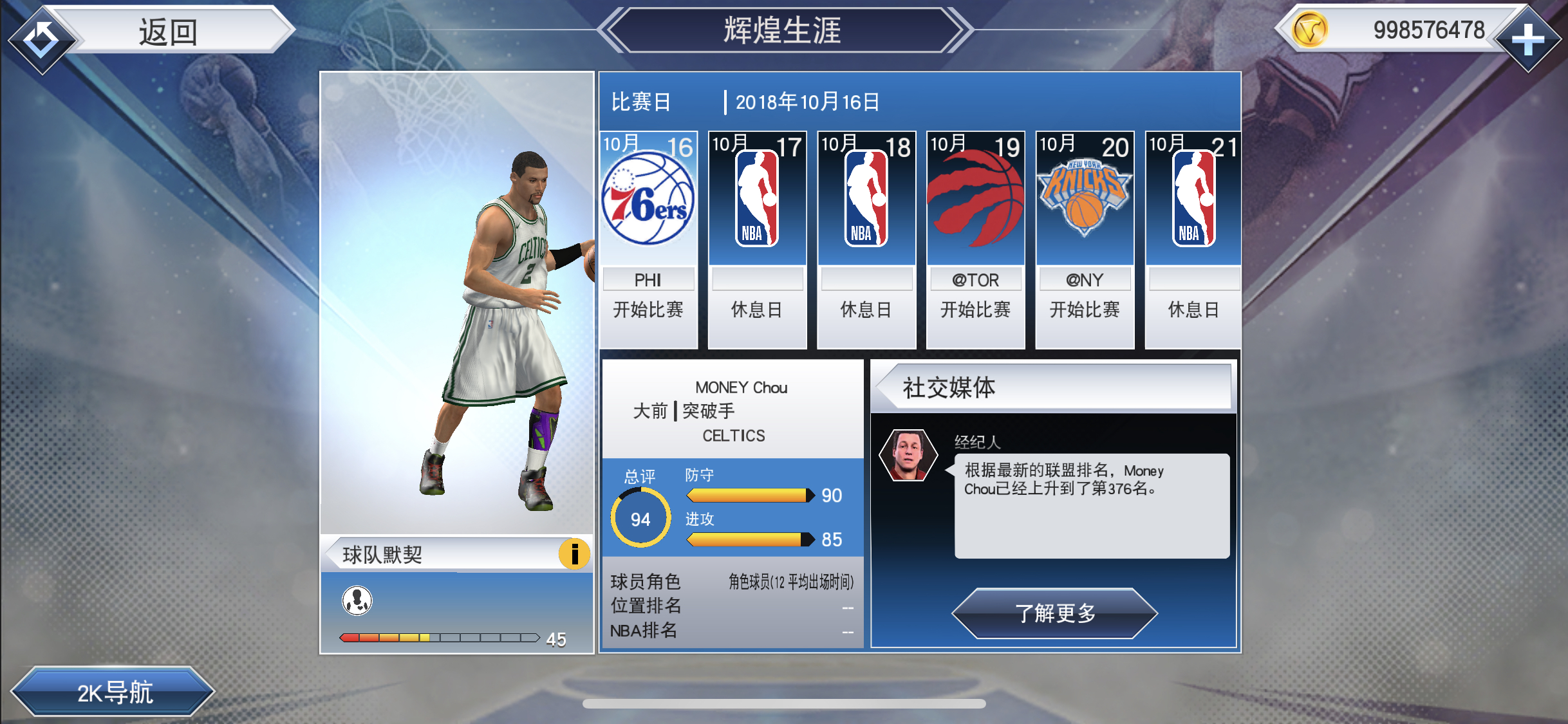 六场比赛全部胜利并且评价A以上。30只球队全部选择了我,当然我选择的是凯尔特人
