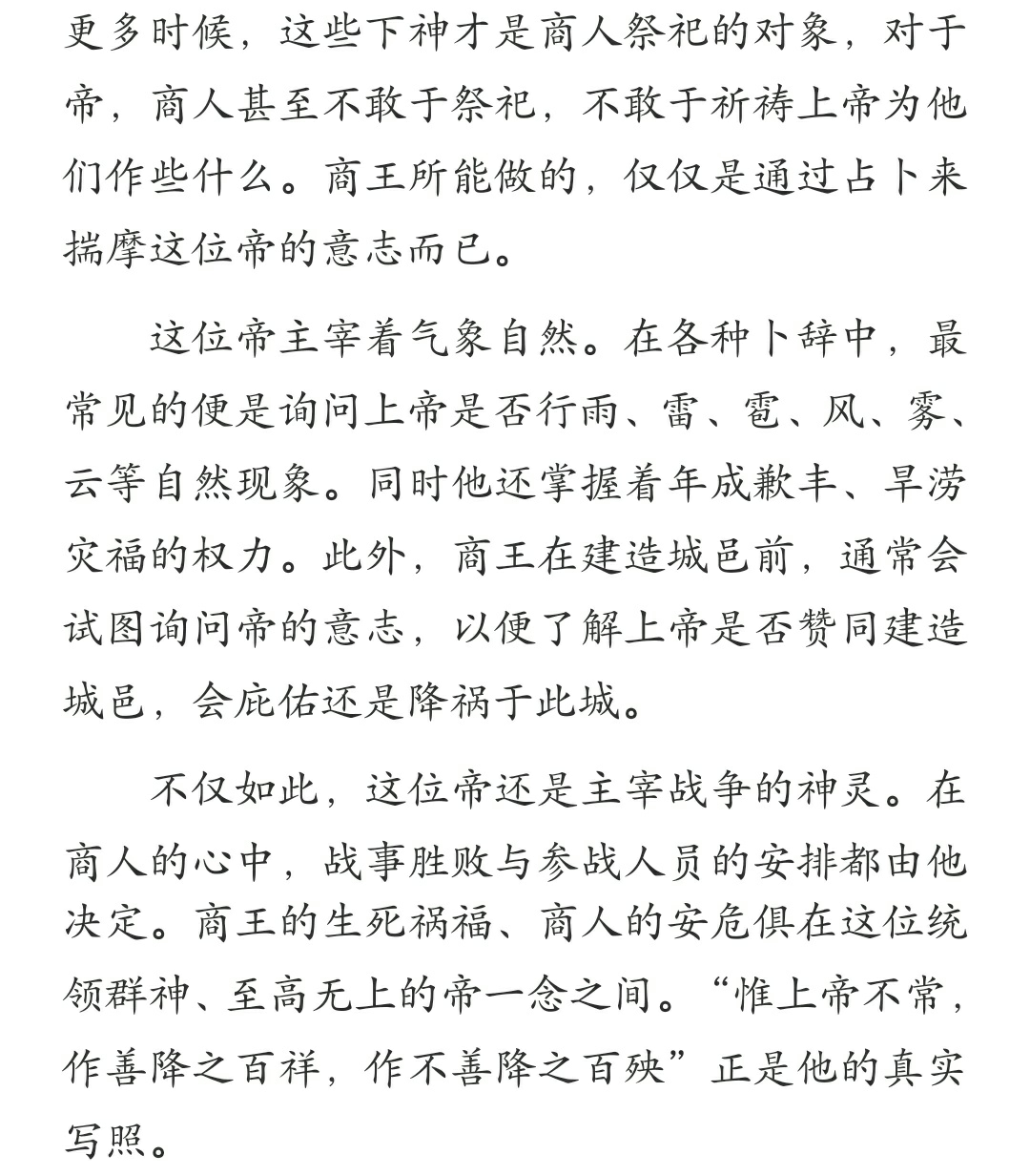 不仅如此,这位帝还是主宰战争的神灵。在商人的心中,战事胜败与参战人员的安排都由他决定。商王的生死祸福、商人的安危俱在这位统领群神、至高无上的帝一念之间。“惟上帝不常,作善降之百祥,作不善降之百殃”正是他的真实写照。
