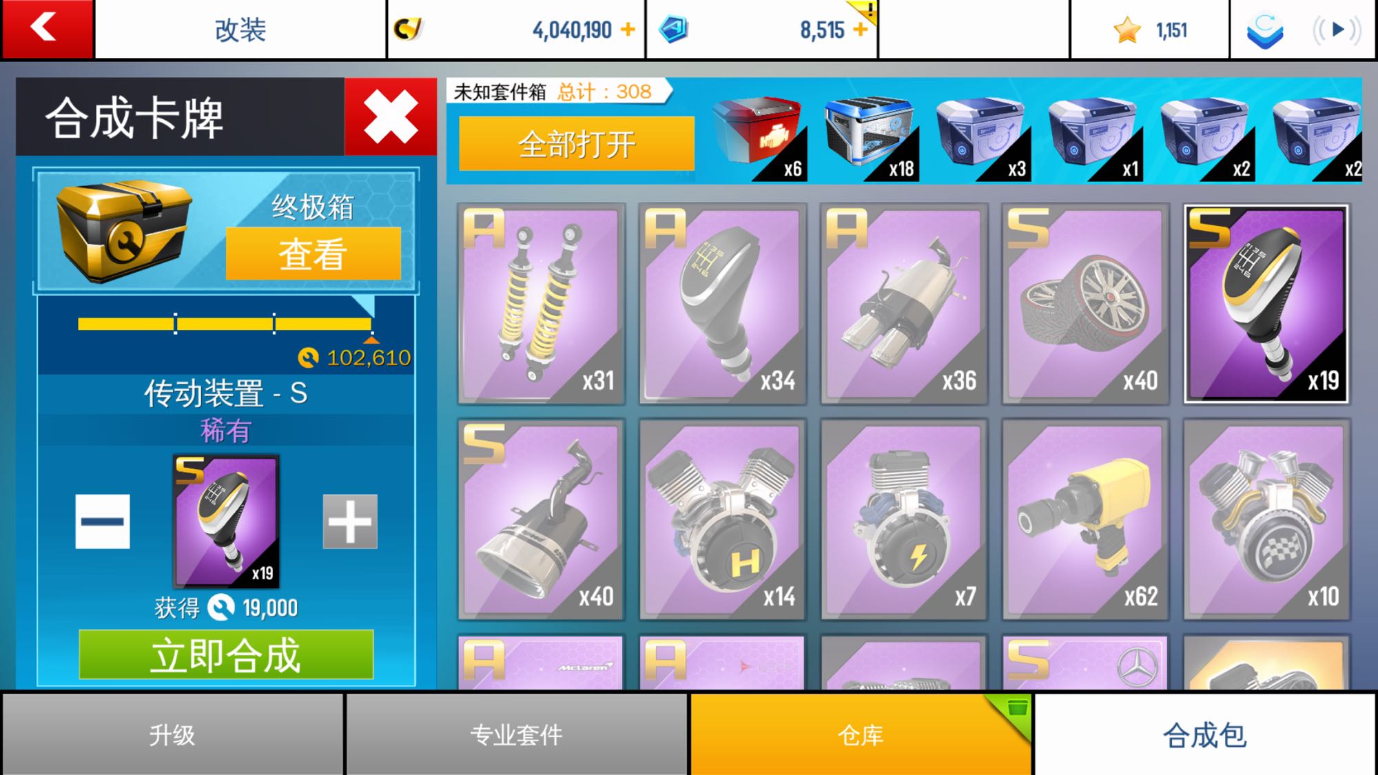 S传动不足使劲开箱合卡,往上滑动的时候不小心变成长按,没注意看,S悬挂40几张给我融没了,还好是悬挂,要是传动轮胎就完了,黄鳝还没开搞呢!