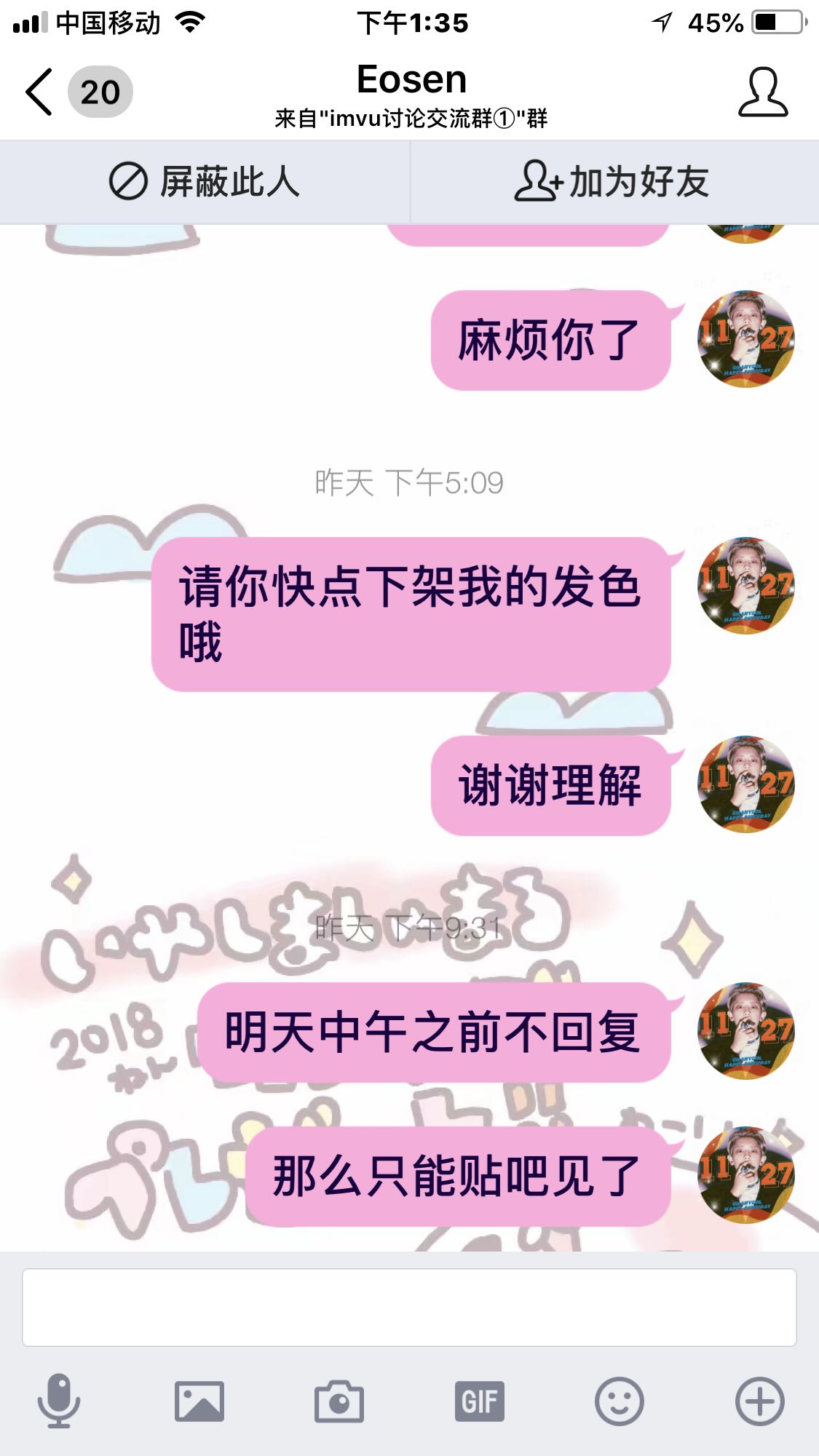 还有请不要告诉我让我佛系,这事没发生在你身上,你体会不到,站着说话不腰疼对伐?我过不去这个坎,我是有权力追究的,况且一开始我也没打算闹到贴吧上来,但是fafa店主一直不回复我呢?我也没办法了。