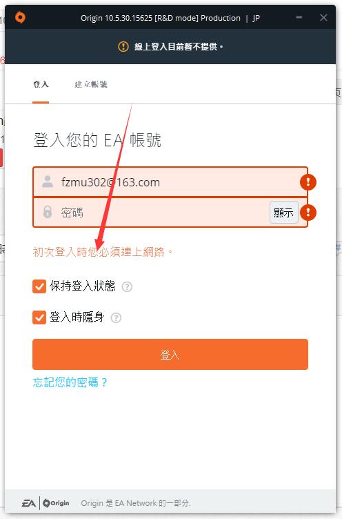 刚刚安装了新的橘子,登录却提示“初次登入時您必須連上網路”