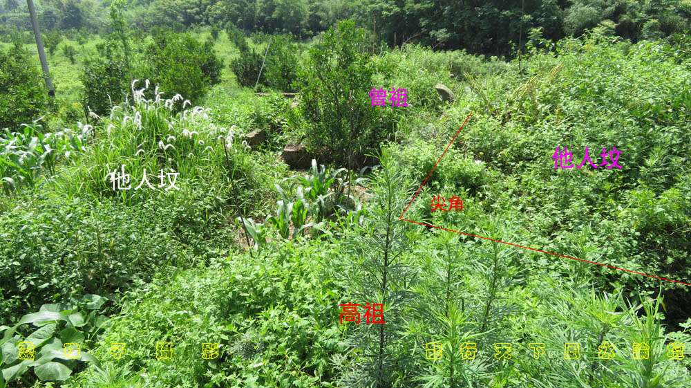 图14,某氏高祖坟最早葬在此山,但自后人发迹以后,左前右前皆有他人挨近而葬,其中犹以右前之坟挨的最近,并且用石砌墙培土,竟然形成一尖角直到某氏拜台前,可惜某氏后人发迹后,少有回来祭拜,亦不重视,未能及时阻止。